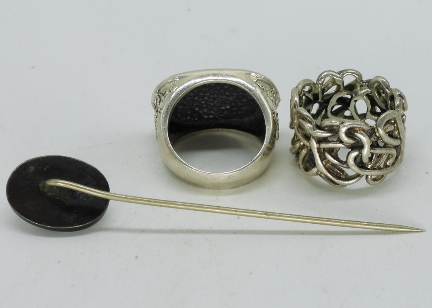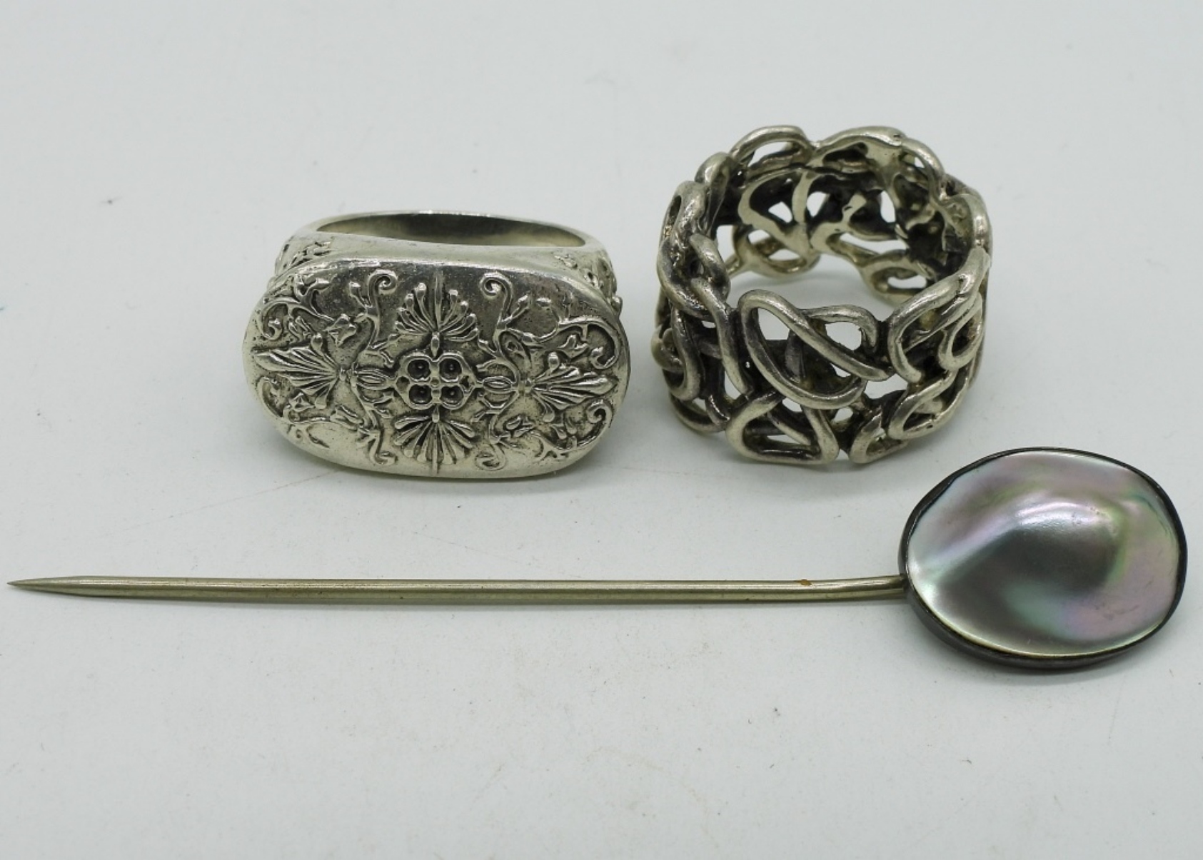 Vintage sterling mother of pearl stick pin and two fashion sterling rings, sizes 7 & 8. (16.4 dwt) (6x4x2)