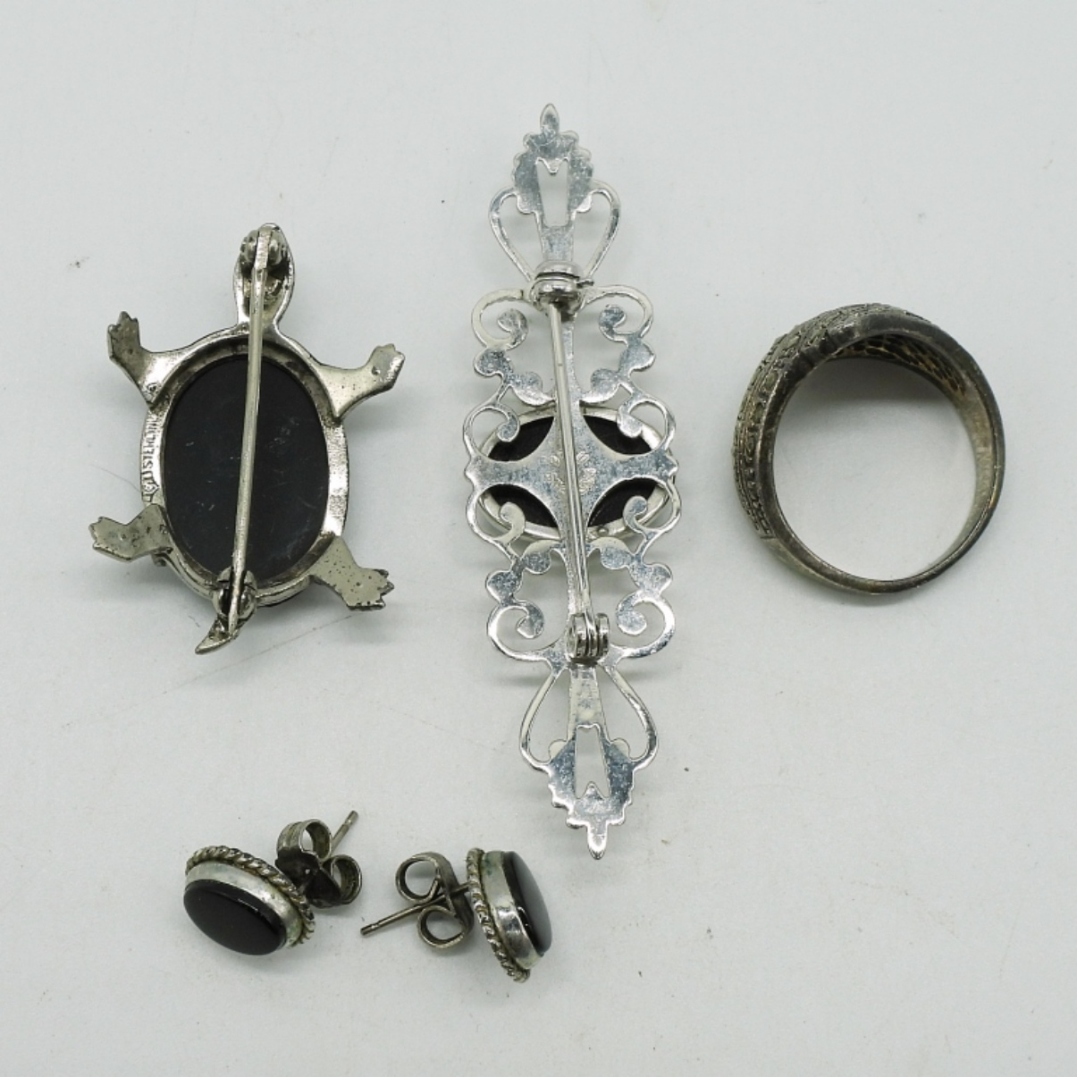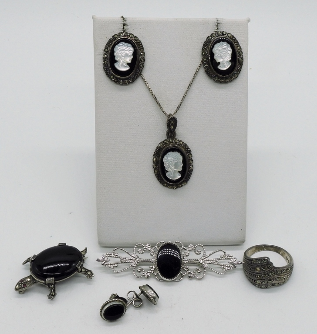 Black onyx, Mother of pearl & Marcasite Cameo Necklace (18″) and pierced earrings. Two brooches, 1.5 & 2″. Ring size 6. Small pierced post earrings with black onyx. (14 dwt) (6x4x2)