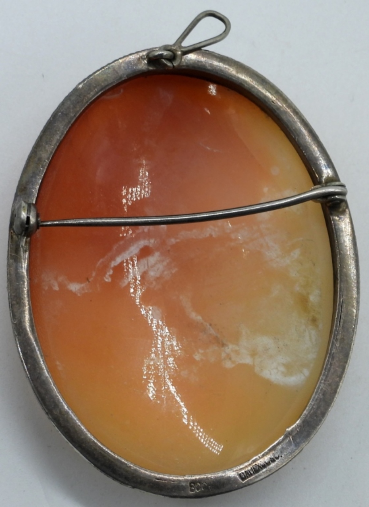 Large vintage Cameo brooch/pin in 800 silver. 2″ long, 1 3/4″ wide. (10 dwt)