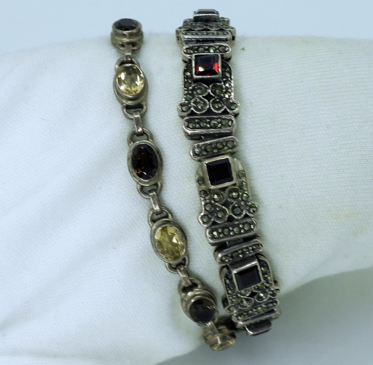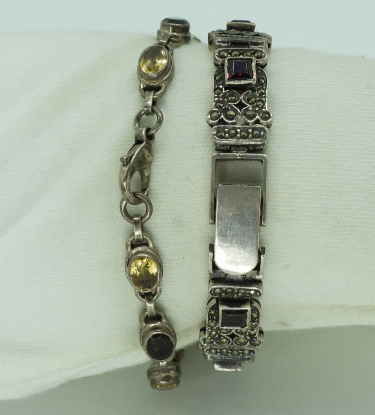 Two sterling bracelets. One with garnets, the other with citrine and smokey quartz. 7″ long. (29 dwt) (6x4x2)