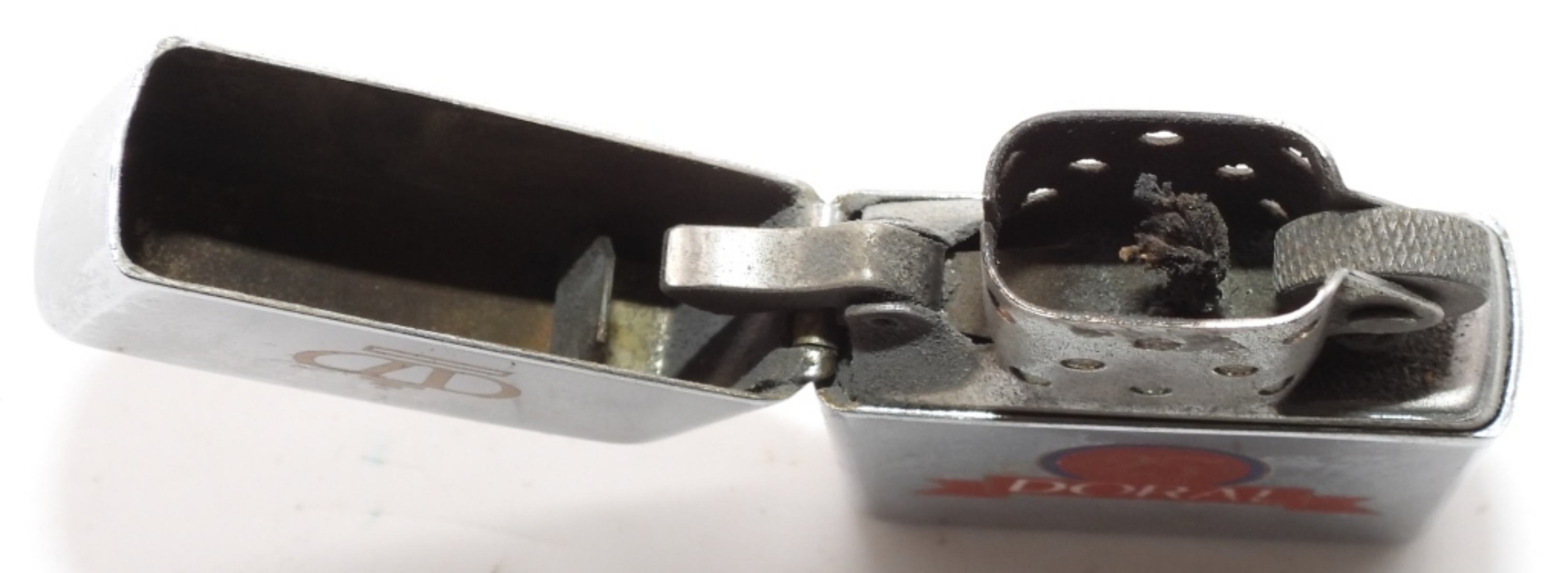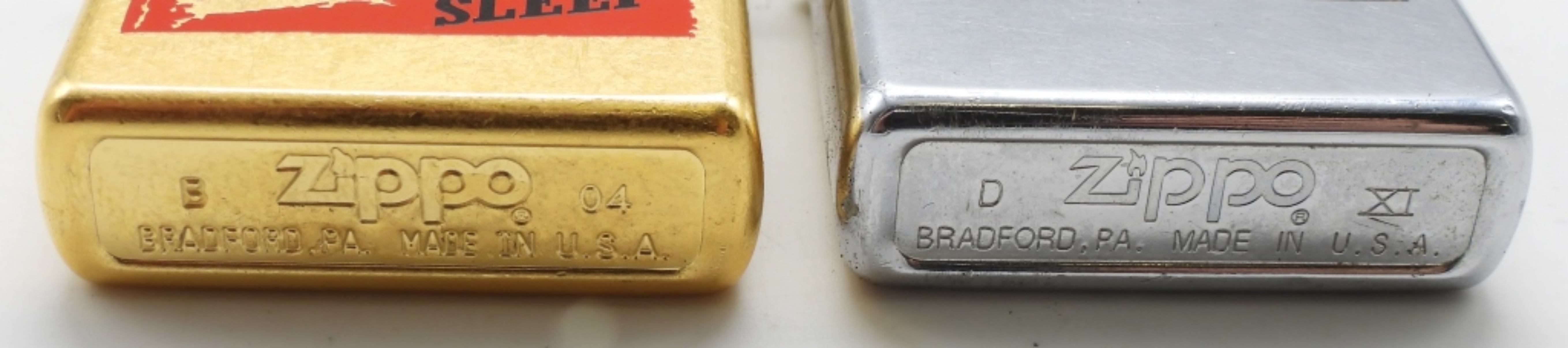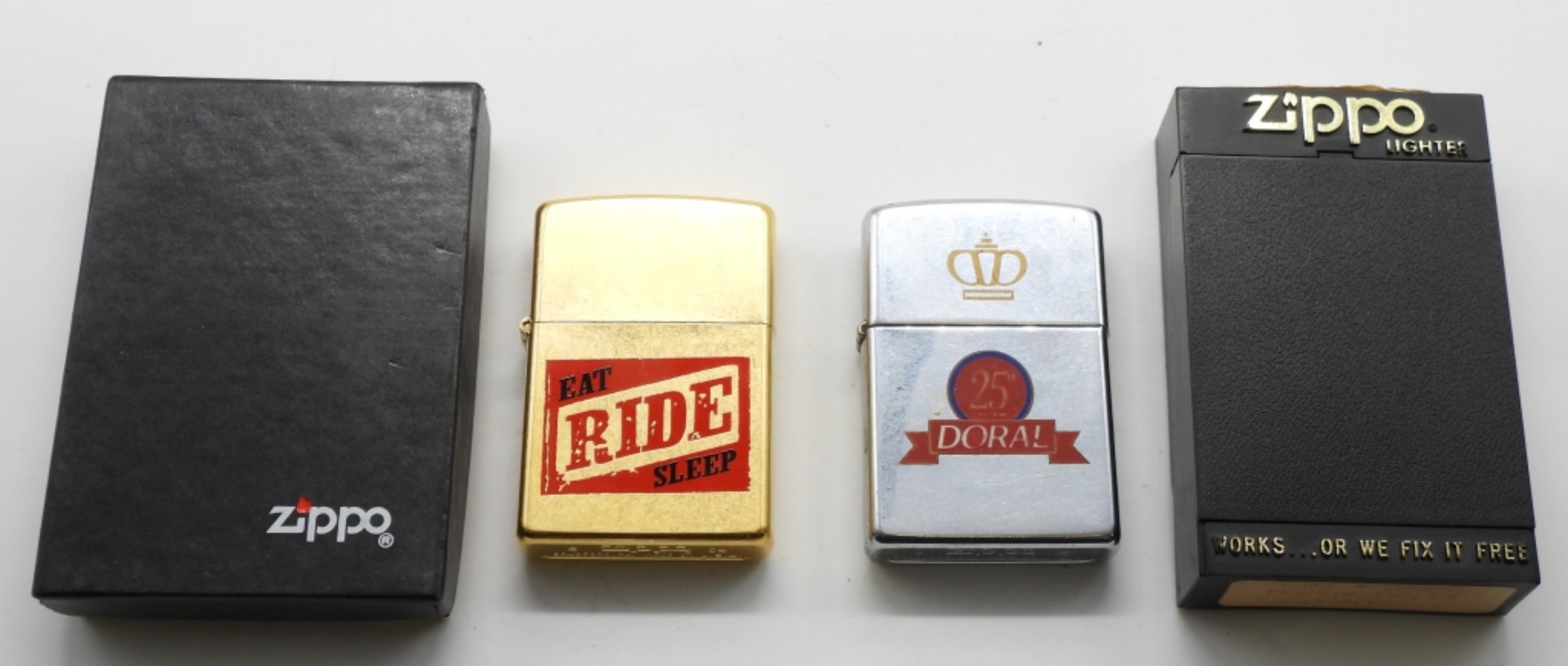 1- 1995 Doral 25th anniversary Zippo, fired. 1- 2004 Marlboro “EAT, RIDE, SLEEP.” Sealed