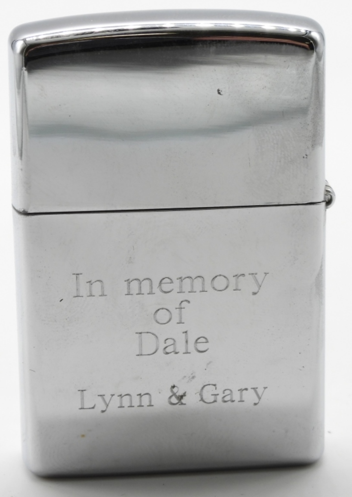The back of the Zippo is engraved. Please see the photos. Comes in a tin case