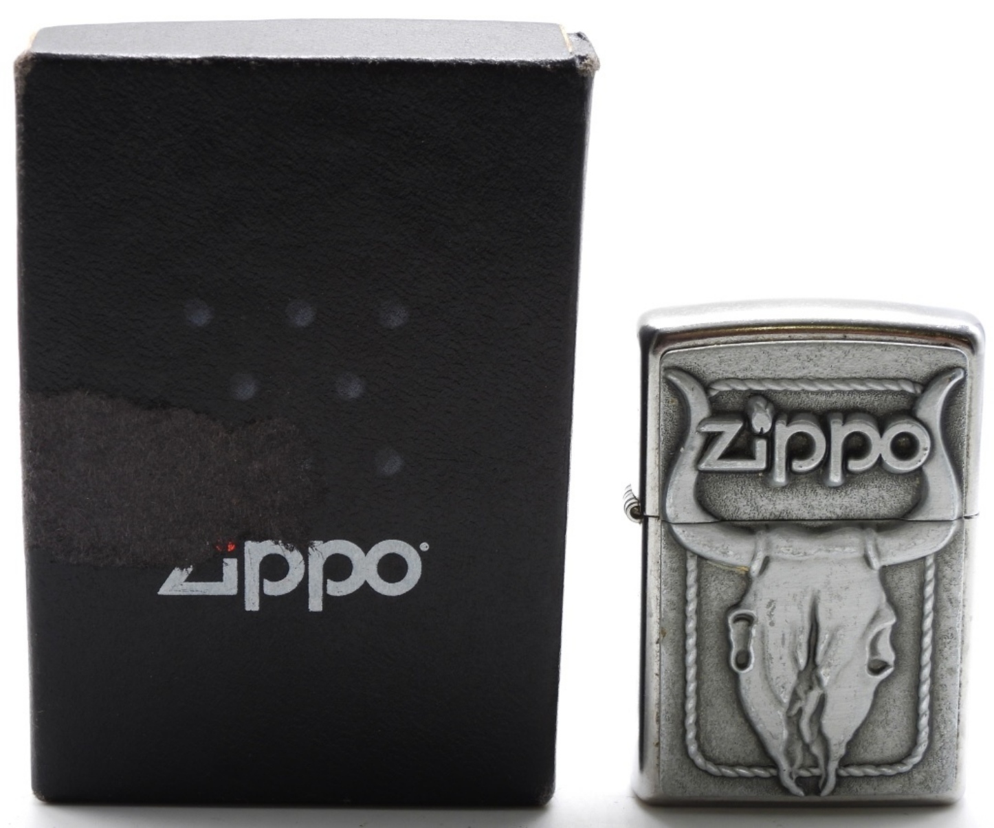 Fired. Comes in a box. 3-D skull effect.
