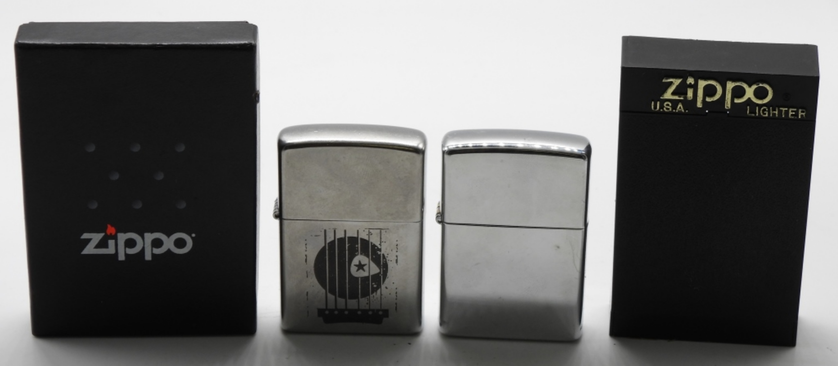 1-1999 Blank Zippo sealed. 1- 2008 Guitar with Pick Zippo unfired. Both come in a box