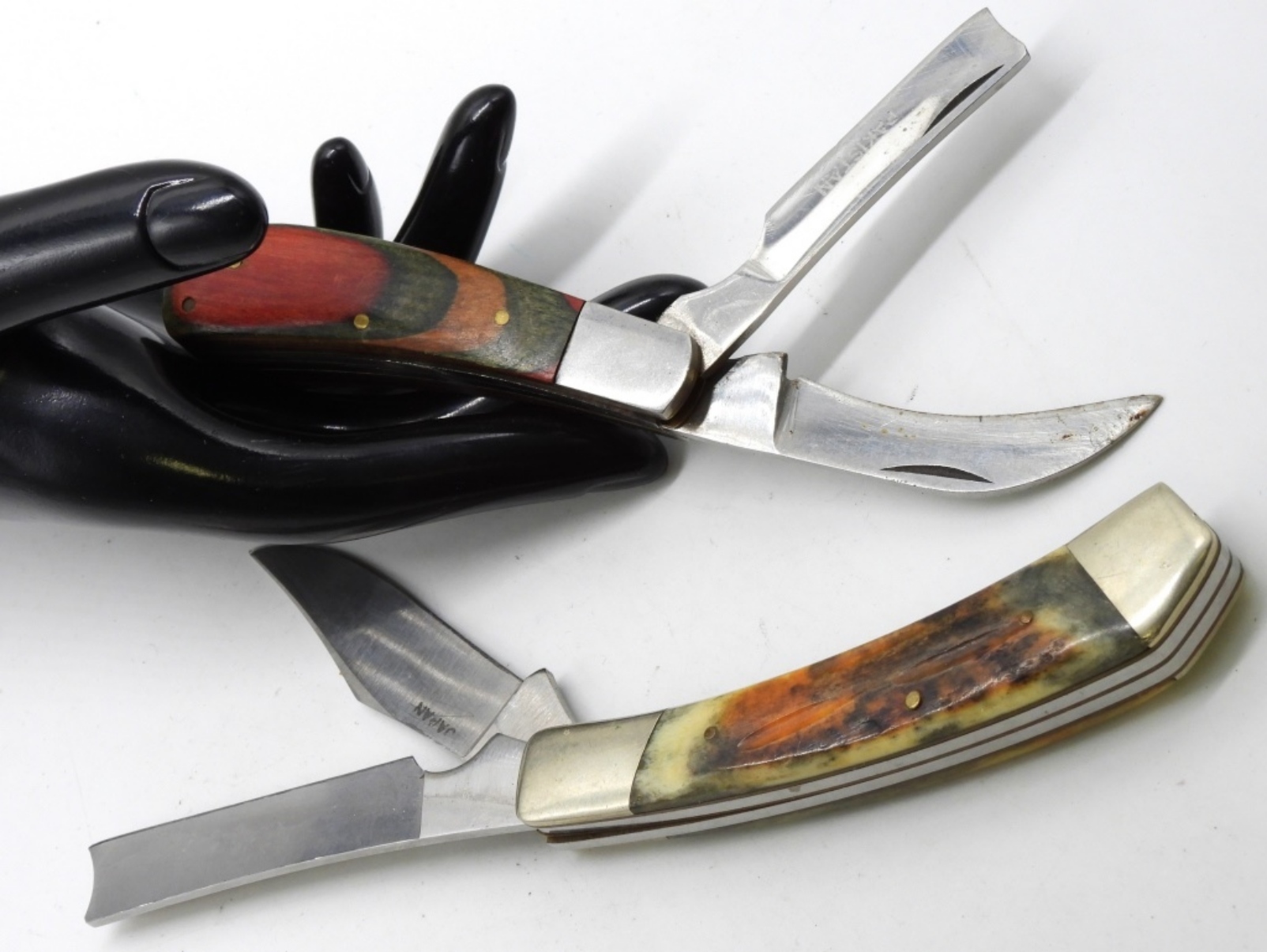 1) Pakistan lock-back two-blade pocket knife. 2) Frost Cutlery stag two-blade pocket knife