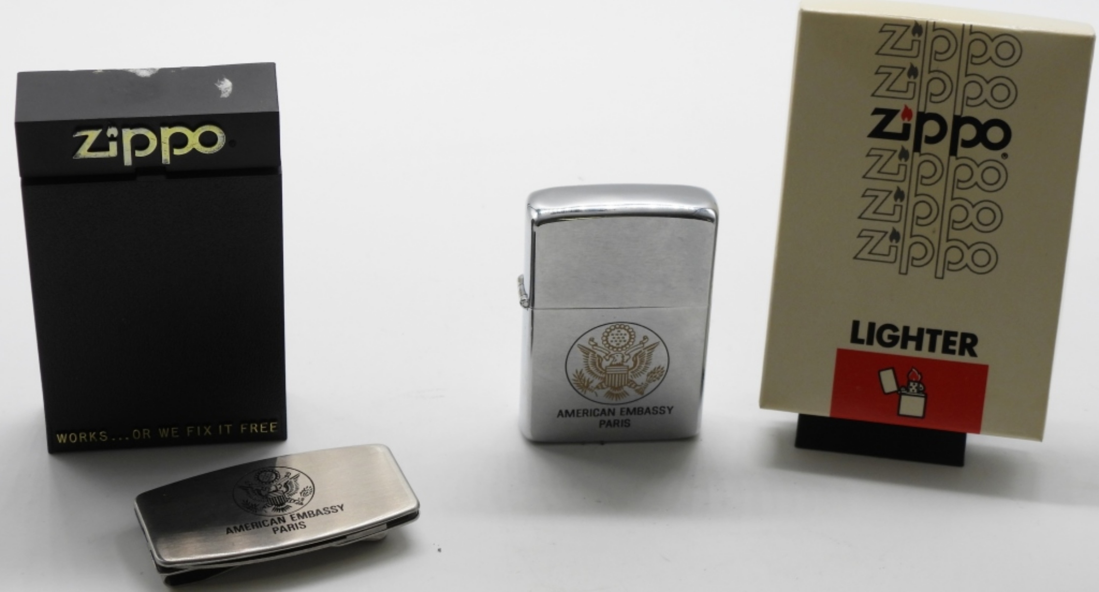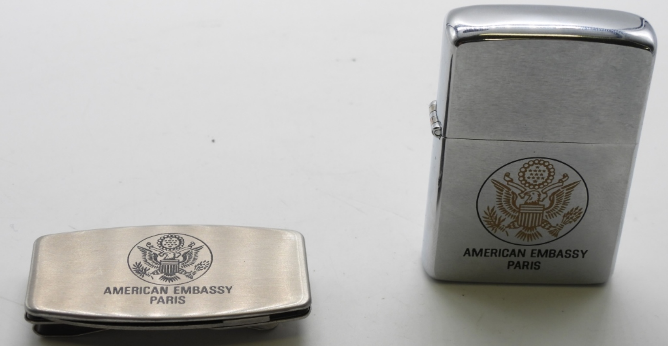 Unfired. American Embassy Paris logo on the front. Comes in a box. Also comes with the matching money clip.