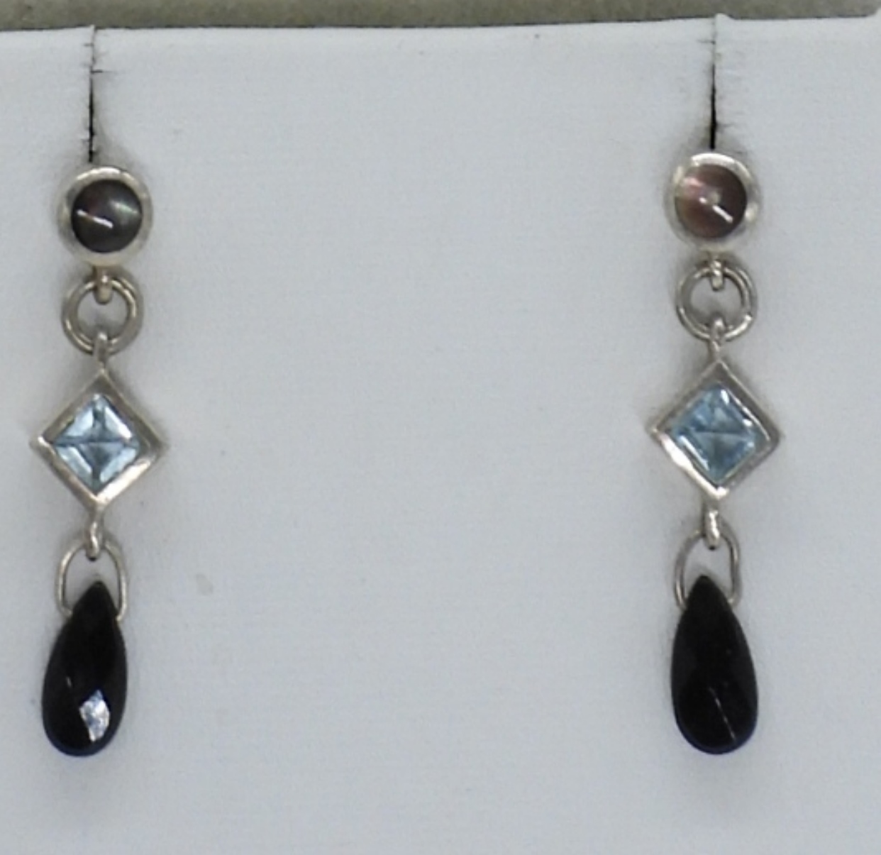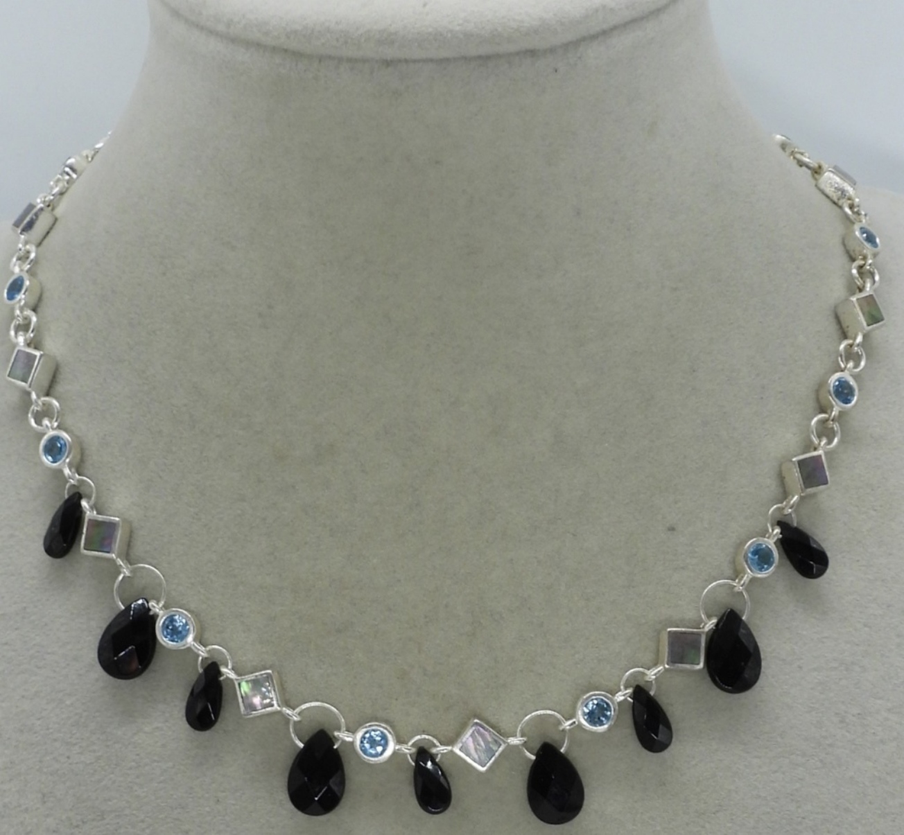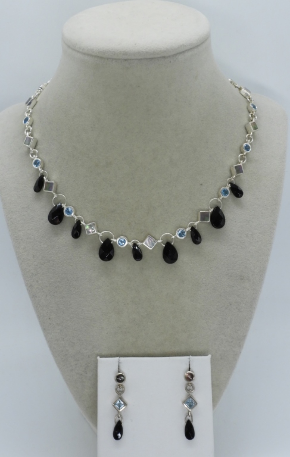 Matching sterling necklace and pierced earrings set. Necklace is 19″ long, earrings hang 1 1/4″ long. Faceted black onyx, blue topaz and abalone gemstones. (18 dwt)