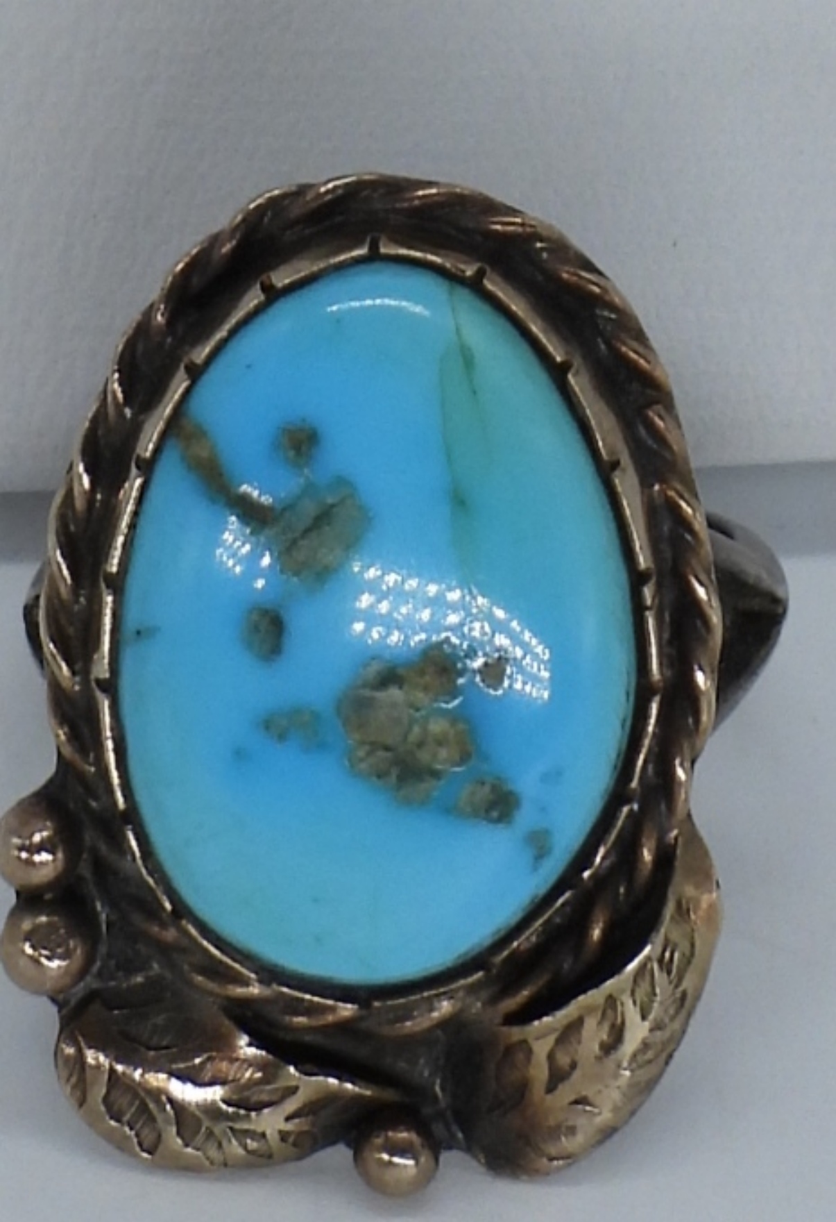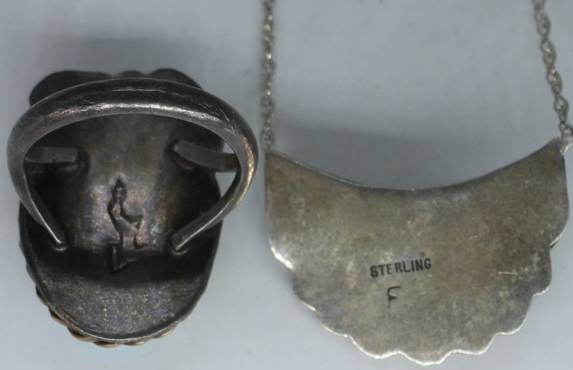 Sterling Navajo turquoise slider pendant (1″ wide – 3/4″ long) on a sterling 16″ chain. Turquoise sterling leaf design Navajo ring, size 6. See photos for markings. (8.6 dwt)