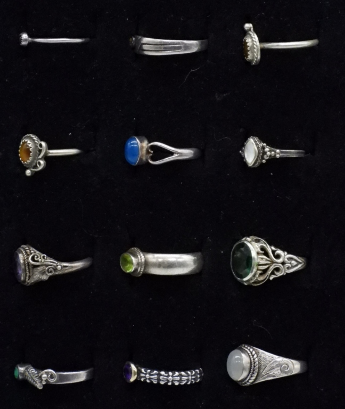 Twelve sterling fashion gemstone rings, sizes 5-8. Mother of pearl, Amethyst, Malachite, Peridot and other gemstones. (18 dwt)