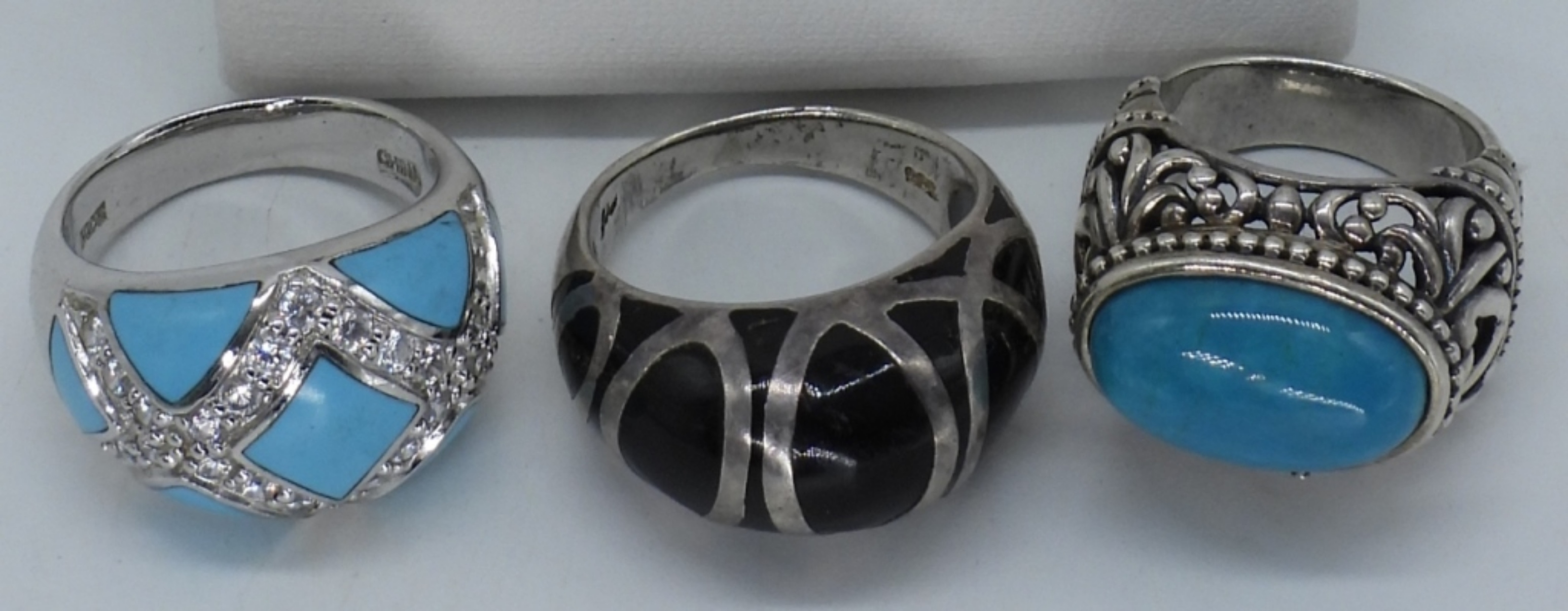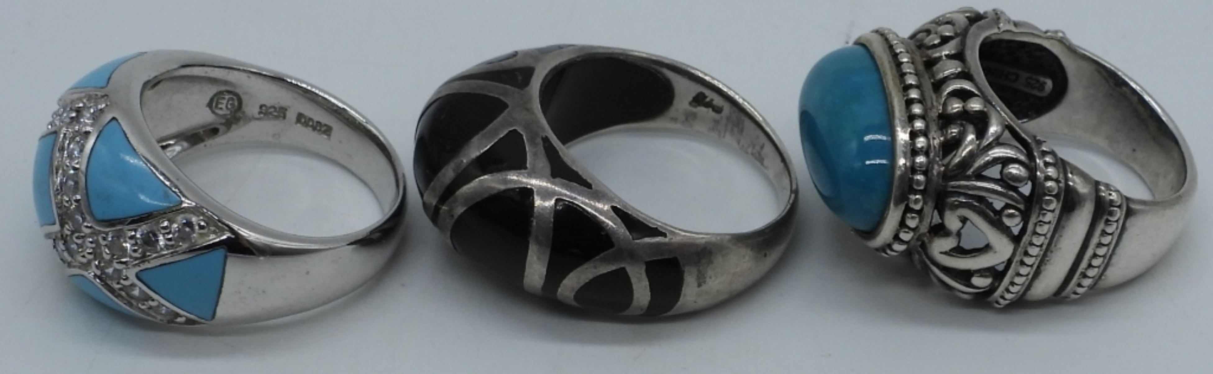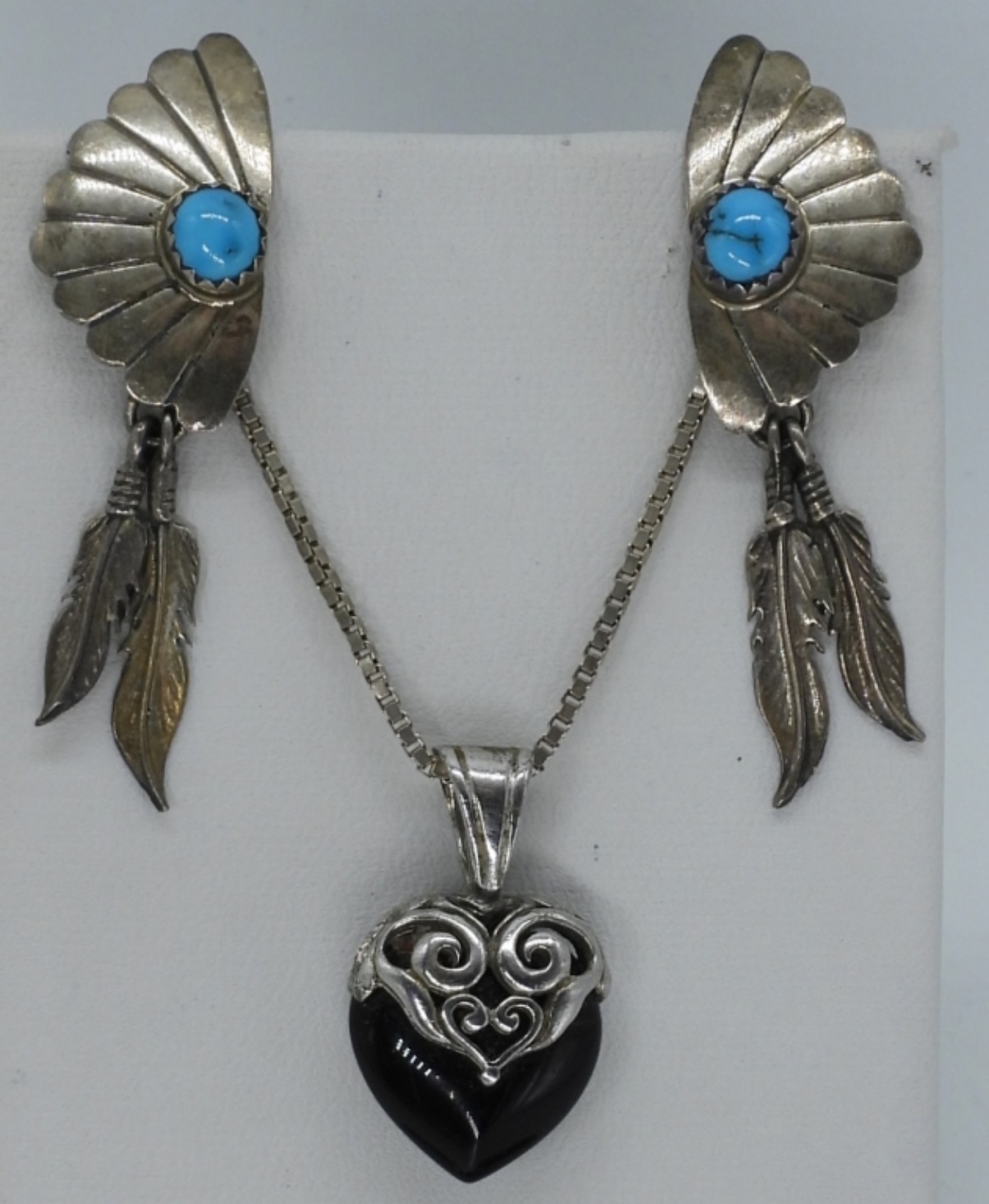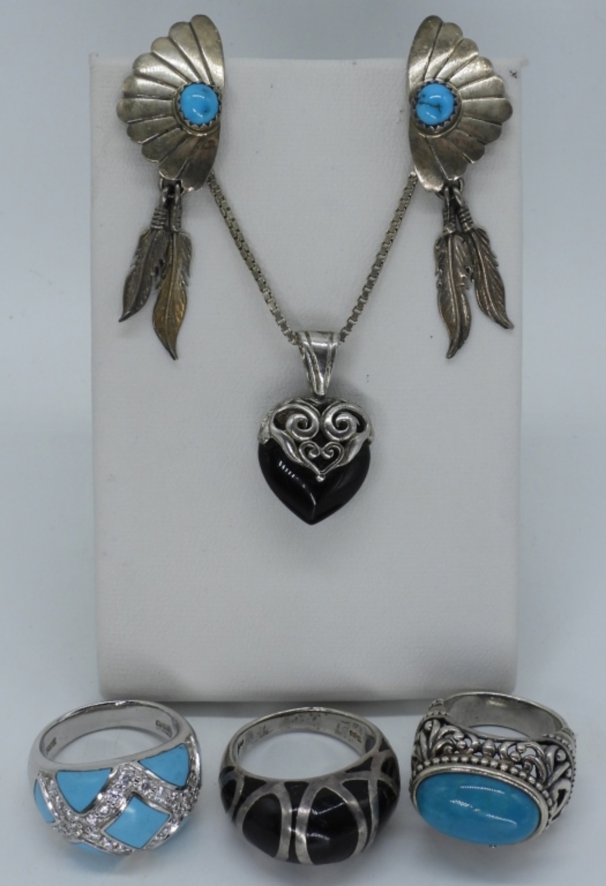Three sterling rings with turquoise and black onyx gemstones, sizes 5 & 8. Sterling and Black Onyx Necklace, 24″ long. Pierced feather turquoise earrings, 2″ long. (22 dwt)