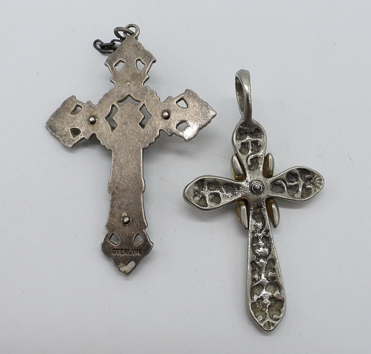 Two sterling religious cross pendants, 2 1/4″ long. (11.3 dwt)