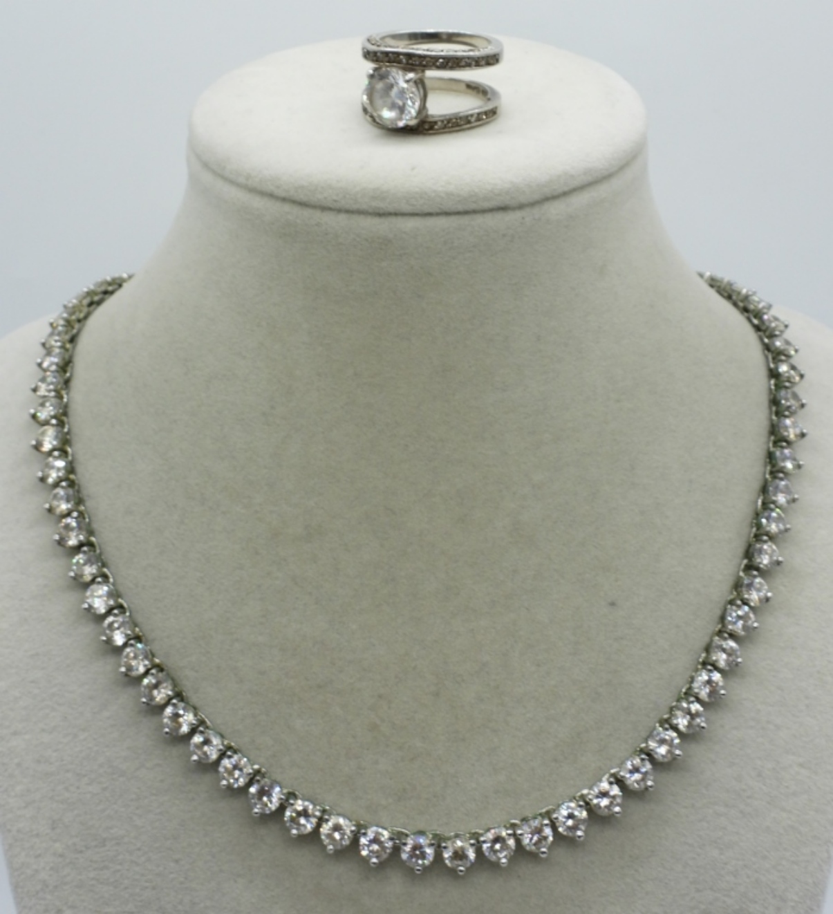 Sterling fashion necklace and ring, with simulated diamonds. Necklace is 18″ long. Ring is size 6.5-7. (27 dwt)