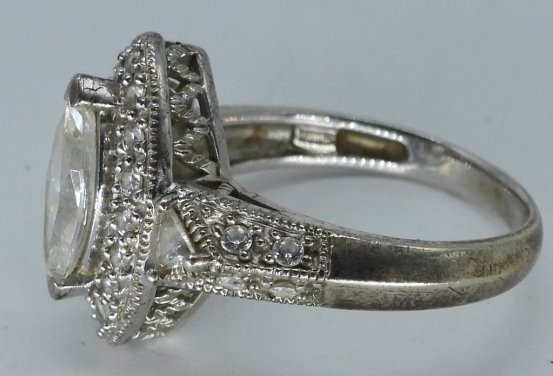 Gorgeous sterling necklace and pierced earring set. Simulated diamonds. Necklace is 18″ long, Earrings hang 1″. Simulated diamond sterling ring is size 8. (9 dwt)