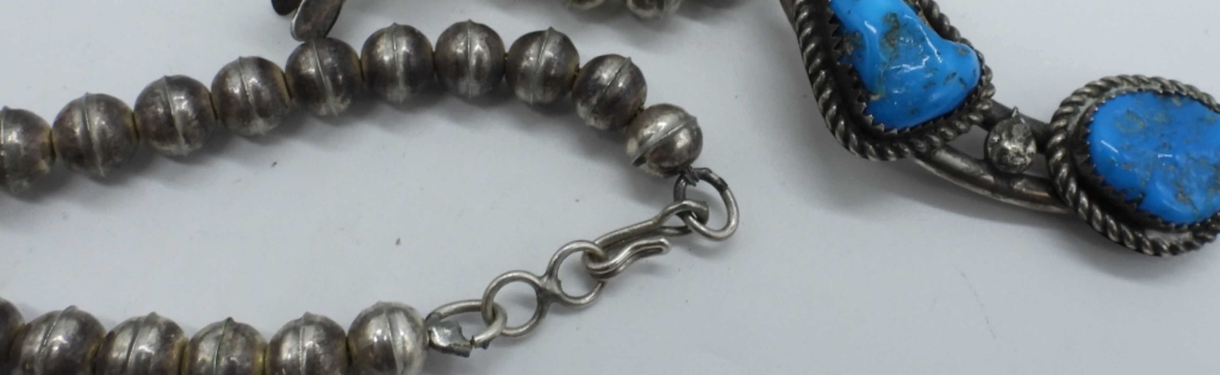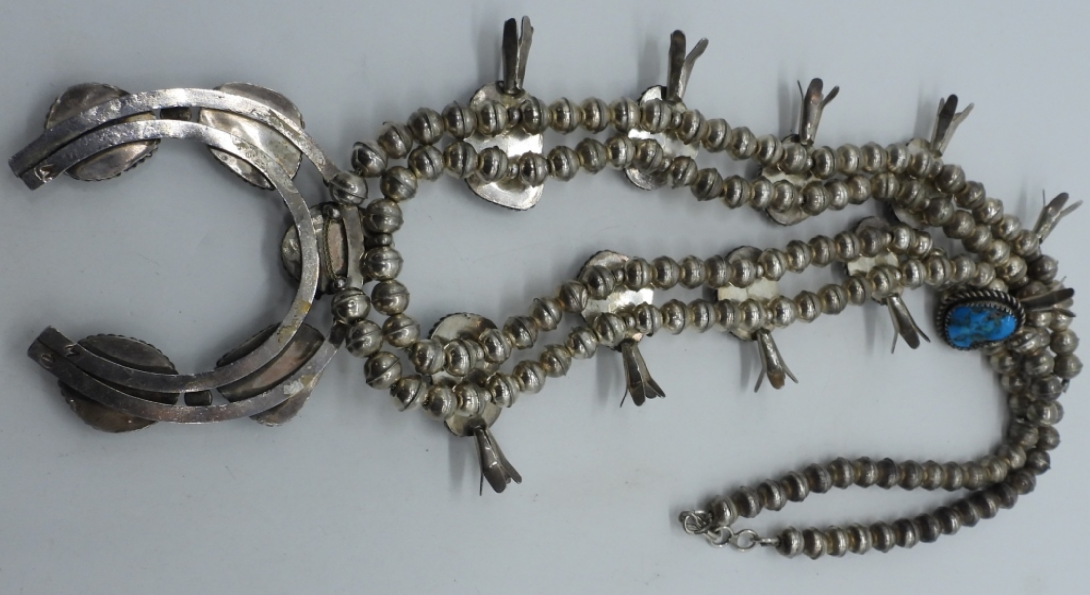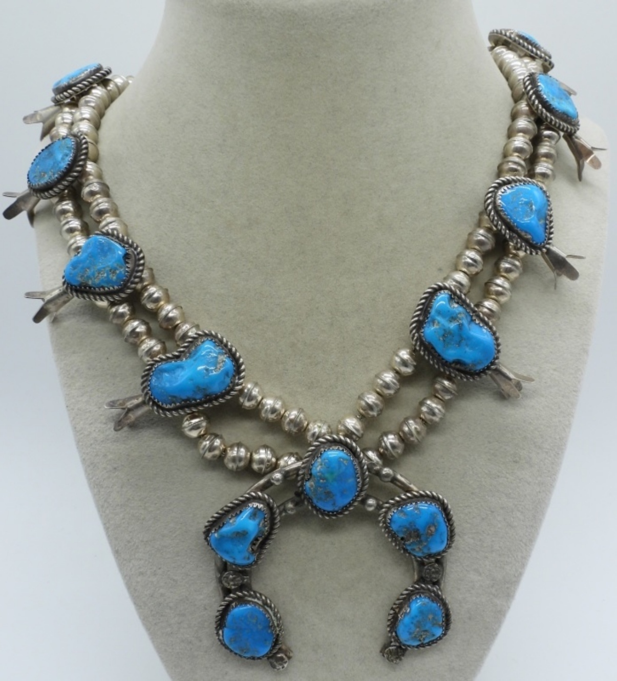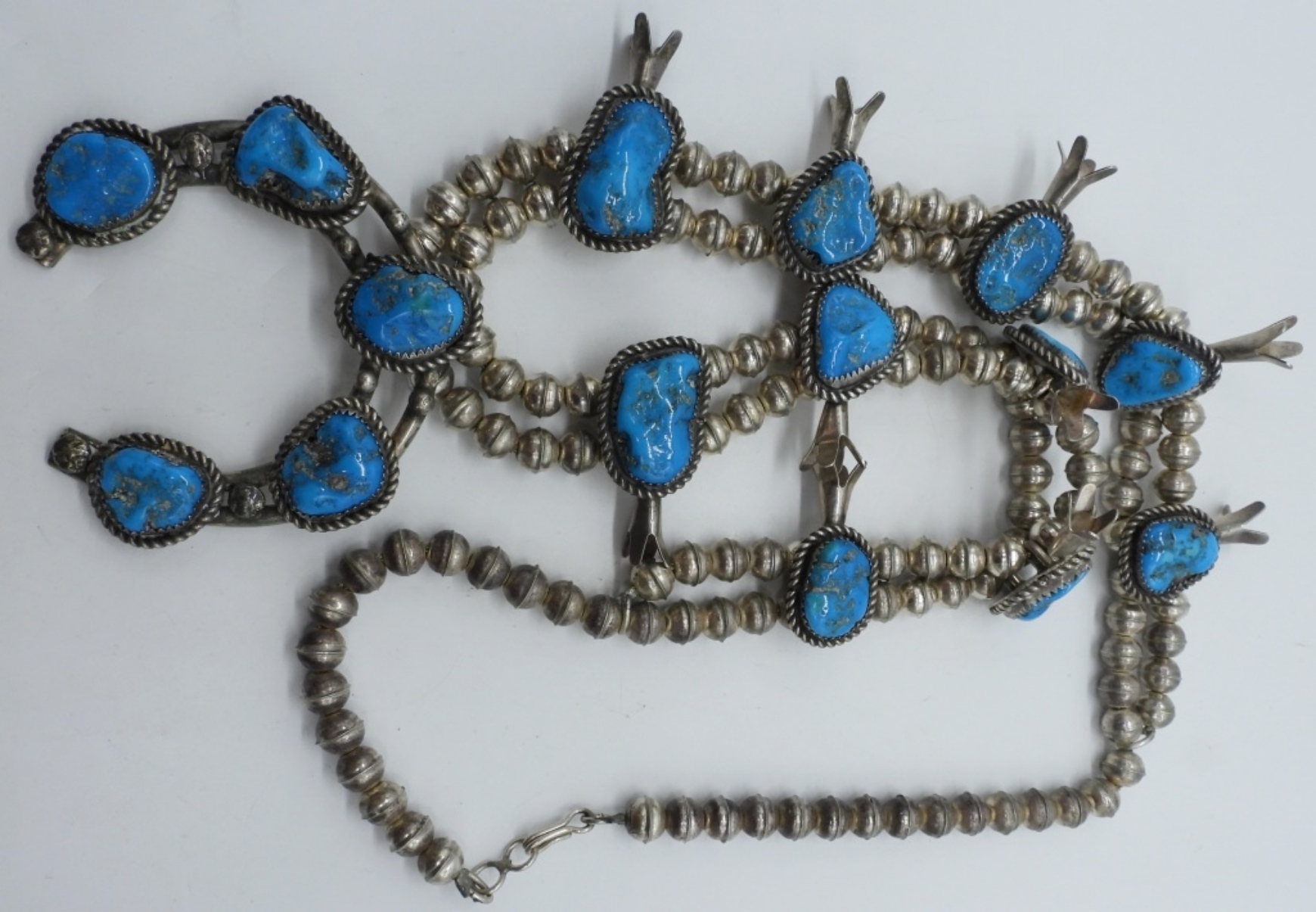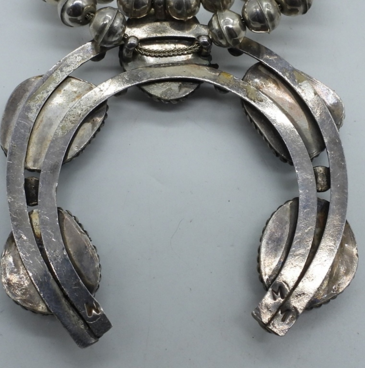 Vintage Sterling Squash Blossom Necklace. Turquoise gemstones. Only marked with three random “M”. 30″ long. Very Heavy. (80 dwt)