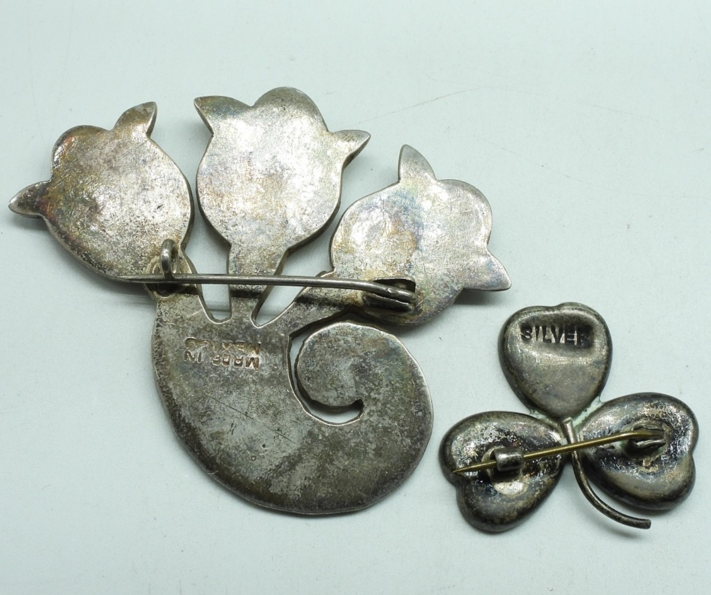 Large floral Mexico brooch with 3 little turquoise gemstones, 2″ x 2.5″. Three leaf clover pin with green gemstones, marked “Silver”, 1″. (21 dwt) (6x4x2)