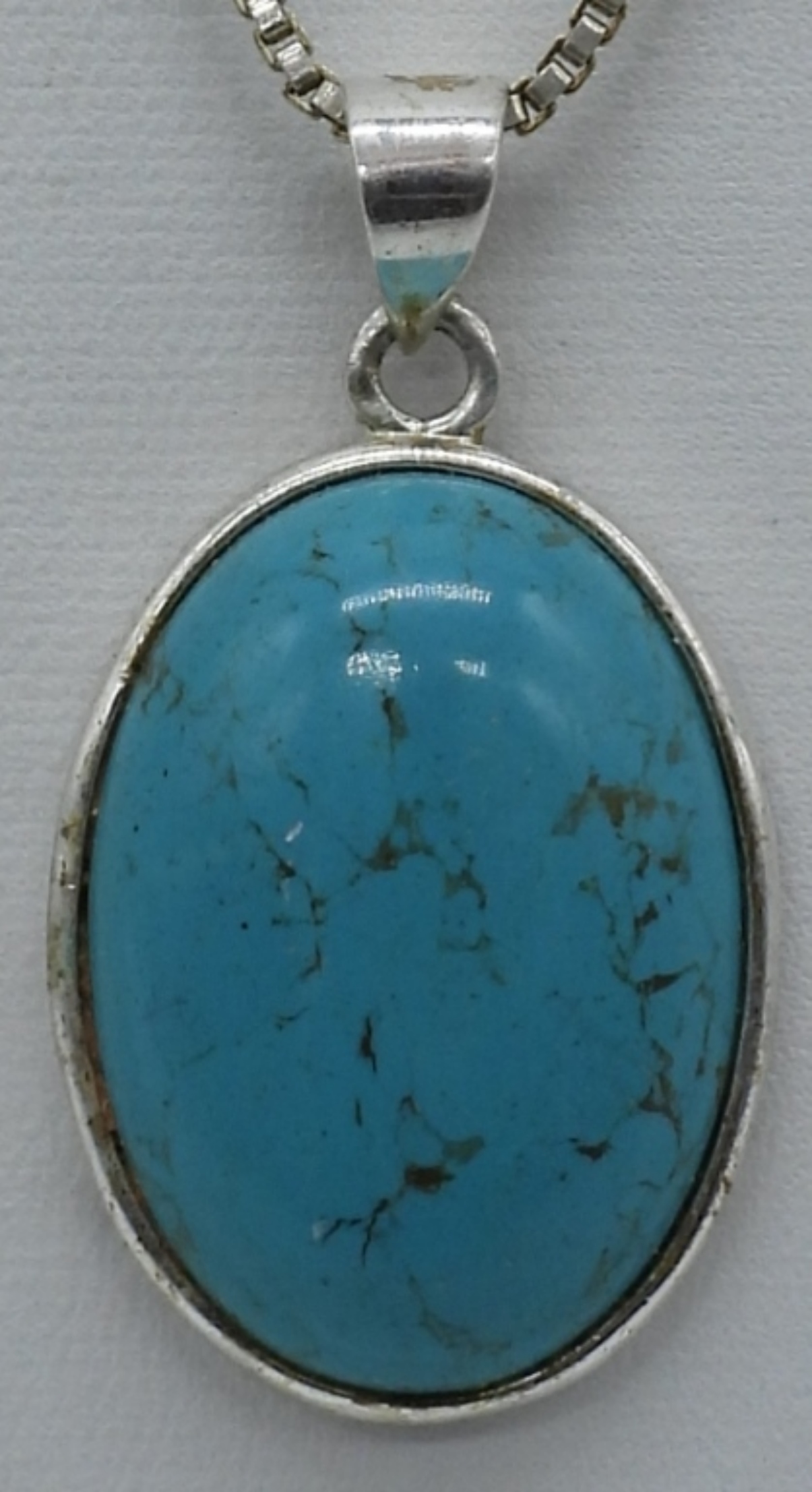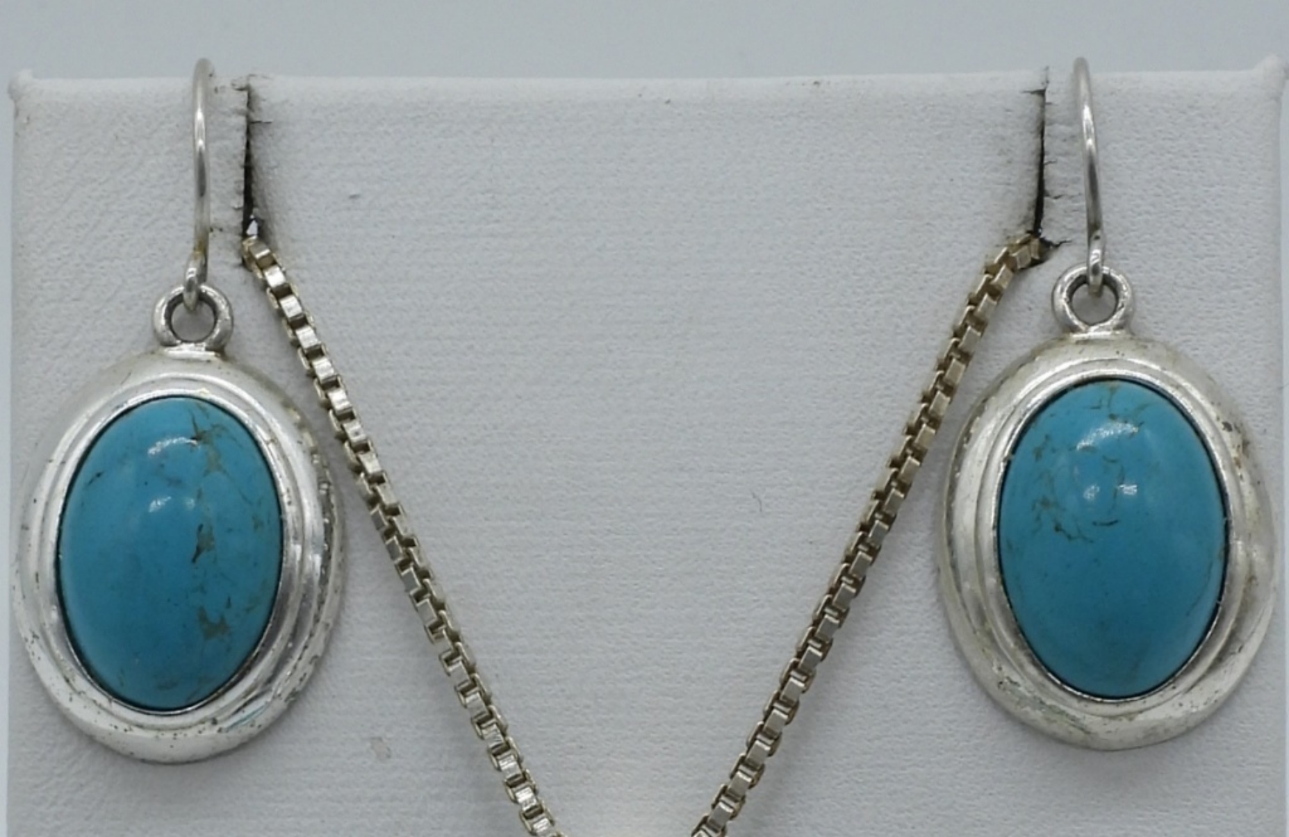 Matching sterling necklace and pierced earrings with turquoise gemstones. Necklace is 20″ long. Earrings hang 1 1/4″. (9 dwt)