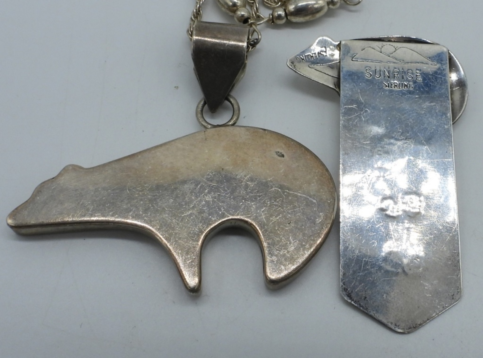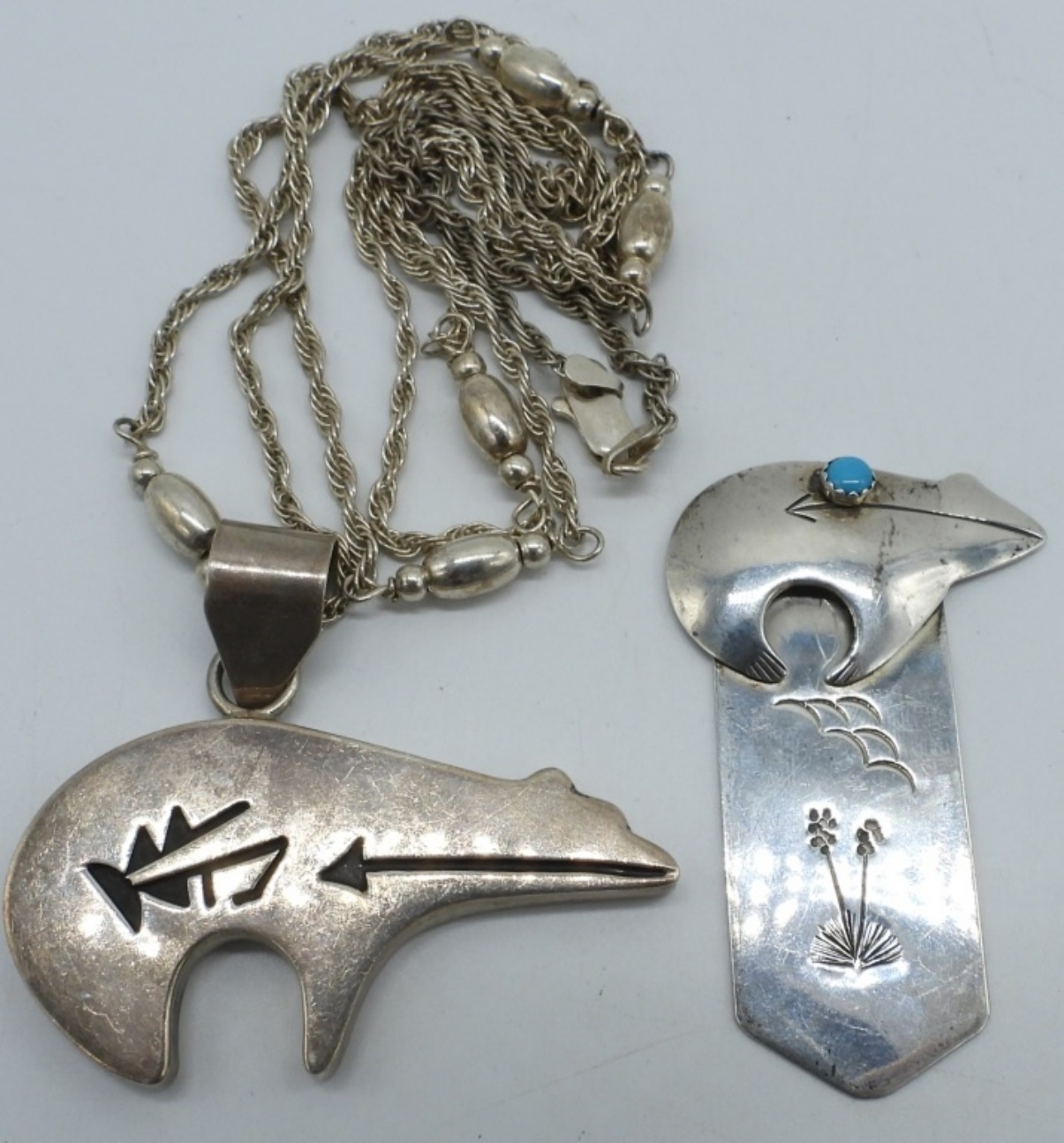 Zuni Bear, Sterling pendant on a 32″ chain. Pendant is 2″ long. Sterling Zuni bear bookmark, 2″ long. (21.5 dwt)