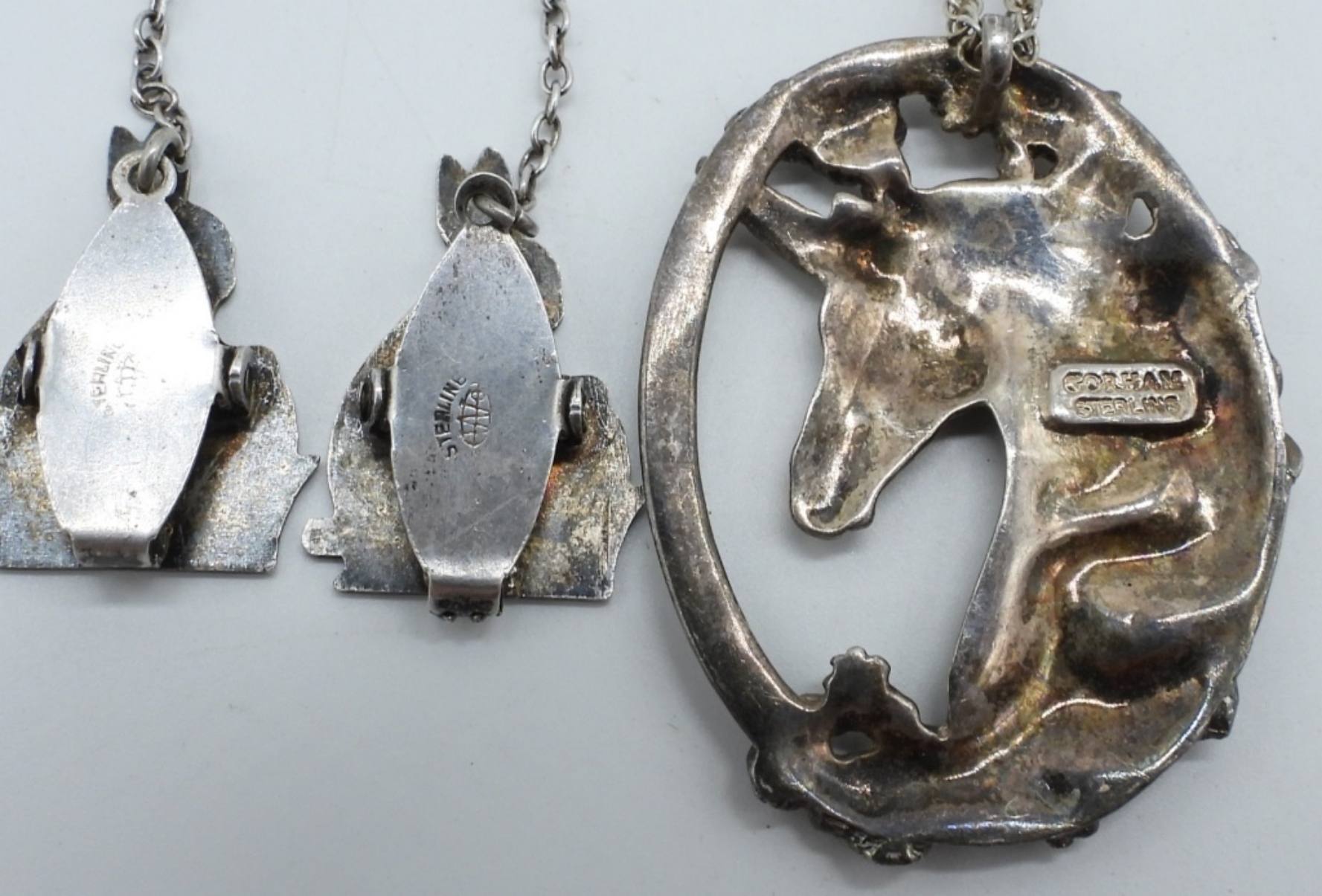 Gorham brand sterling unicorn pendant (2″ long) on a 24″ sterling chain. Bunny sweater clips, 7″ long. (17 dwt)