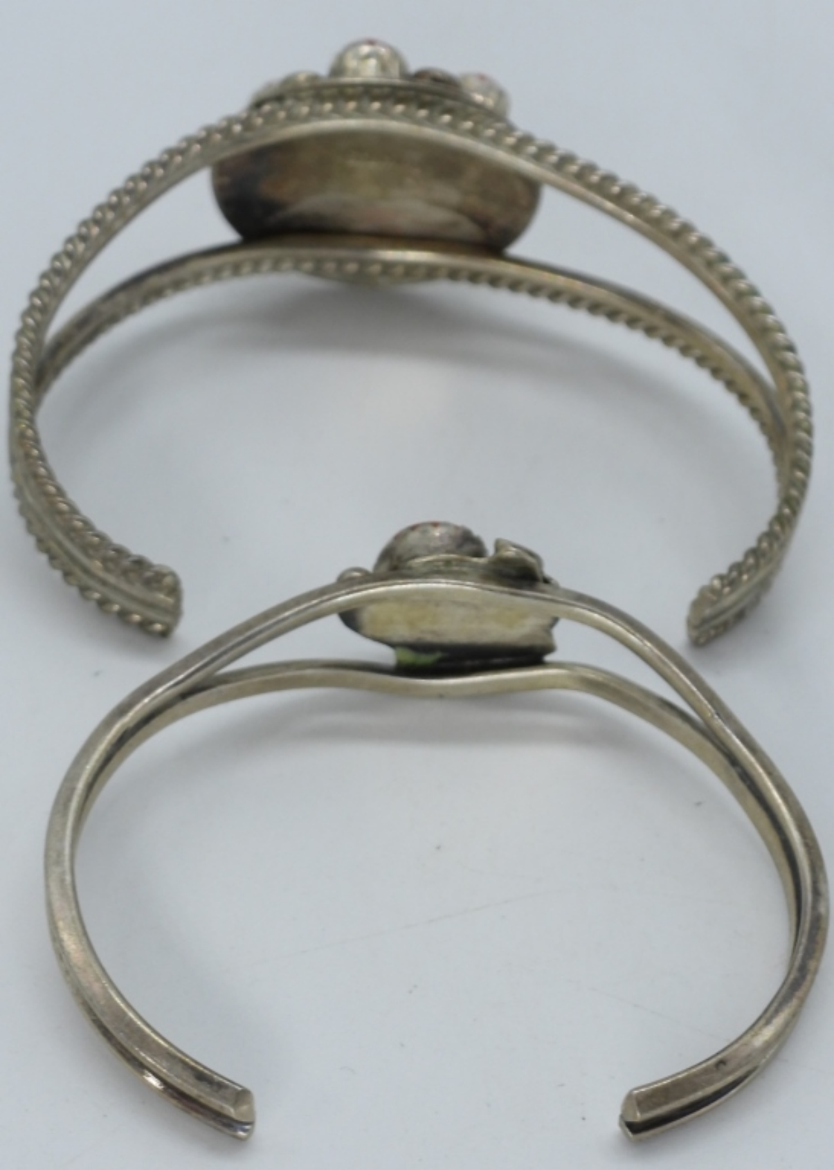 Two sterling petite cuff bracelets with red coral gemstones. 4″ and 5″ inside. (11 dwt)