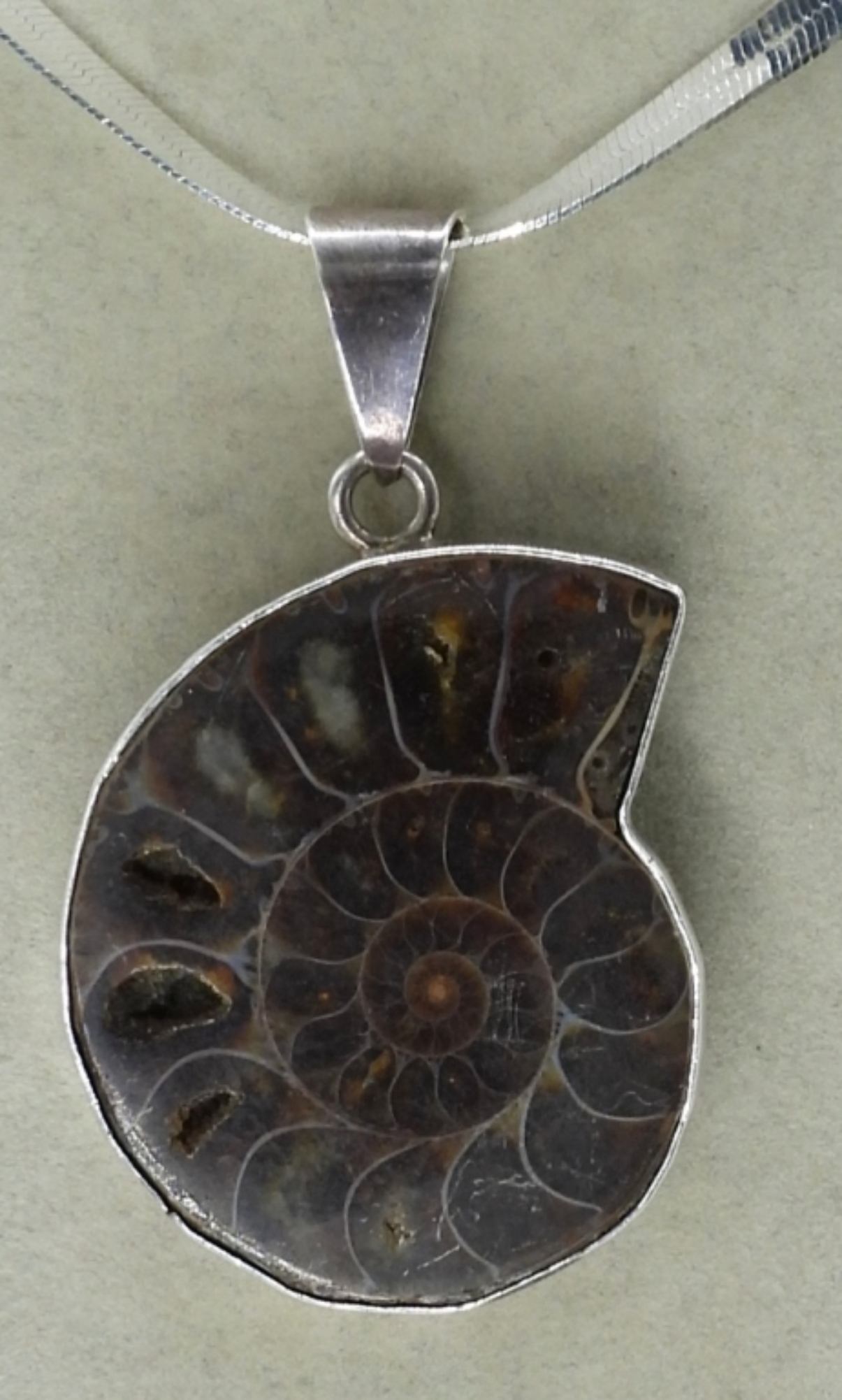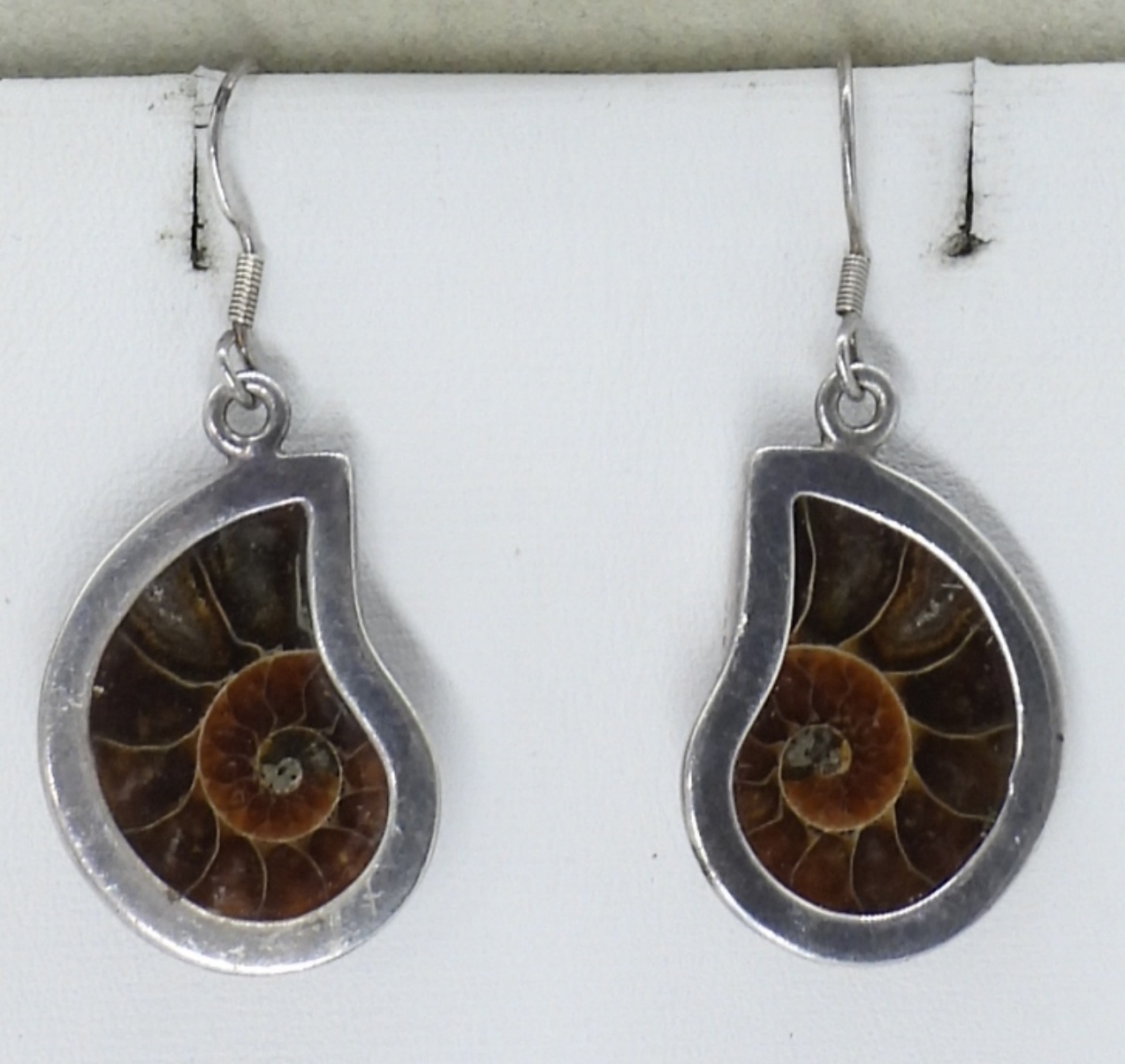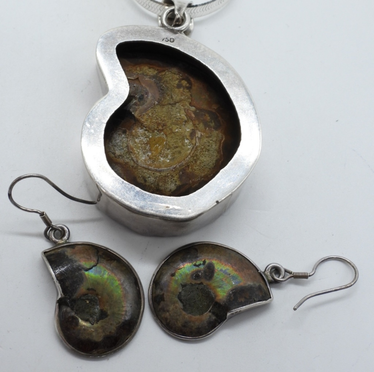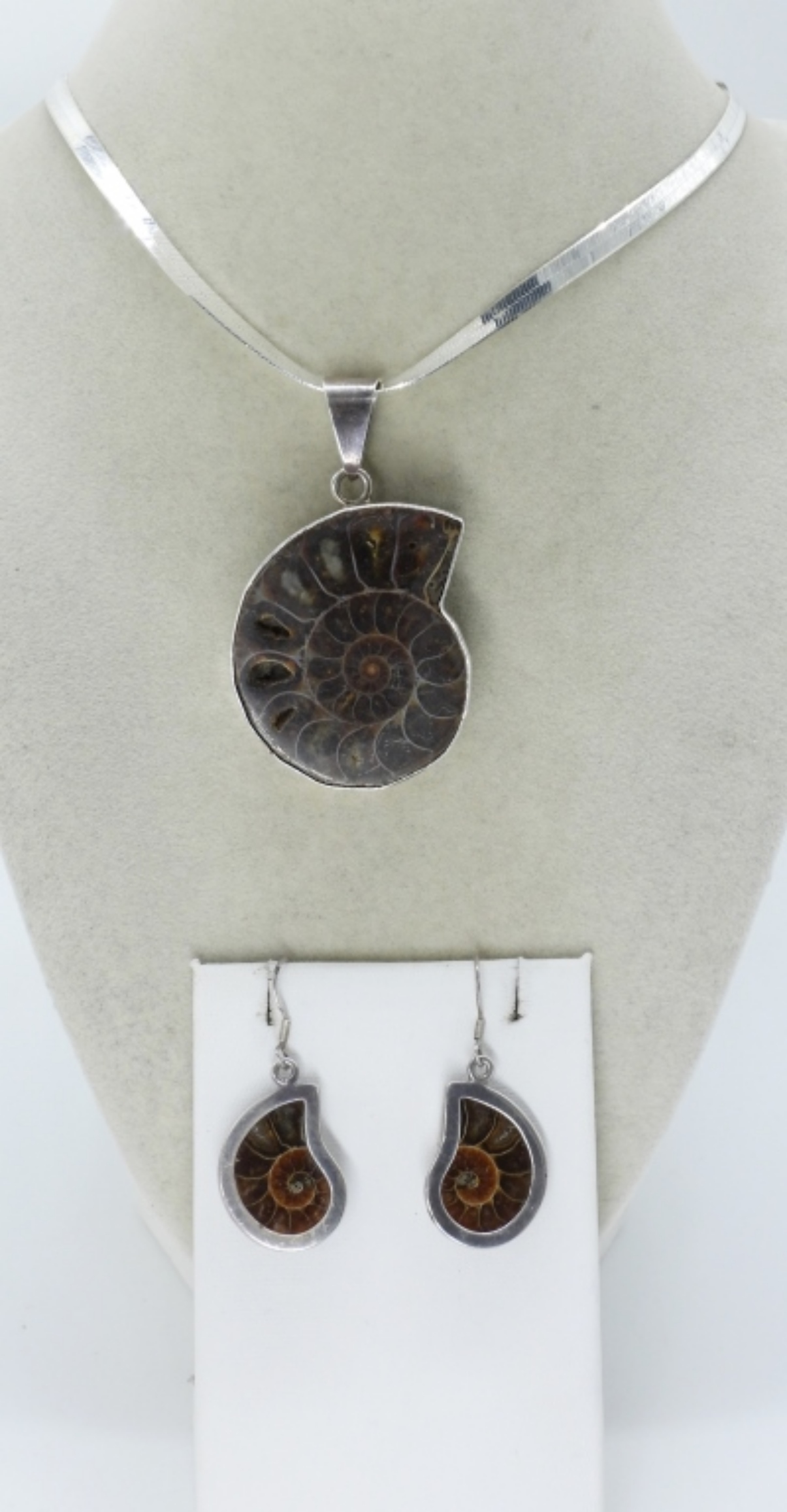 Ammonite fossil, sterling necklace and pierced earrings. Pendant is 2.5″ long on a 30″ sterling herringbone chain. Earrings hang 1.5″. (29 dwt)