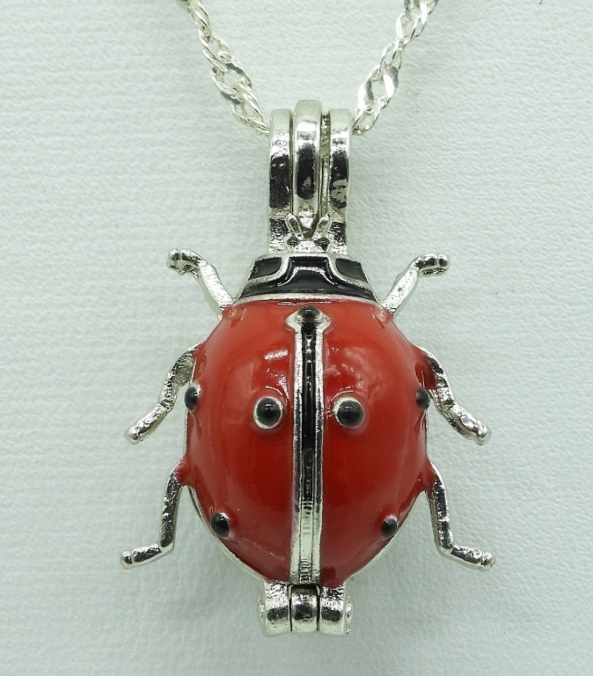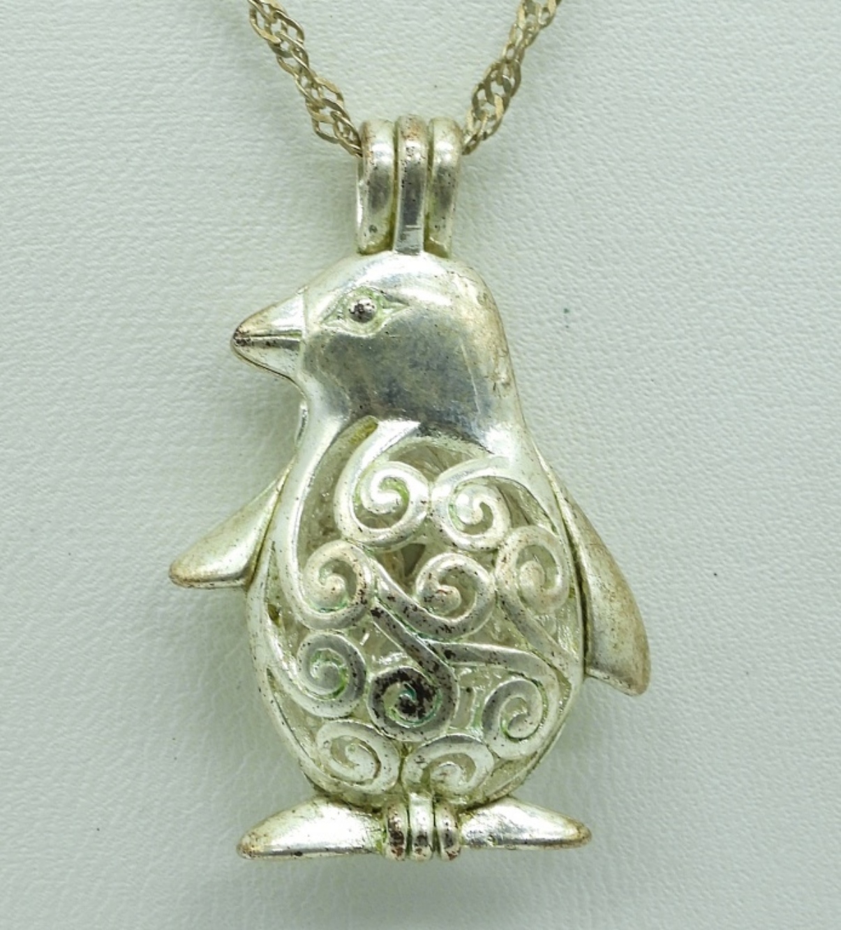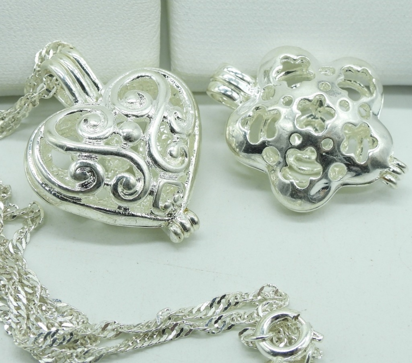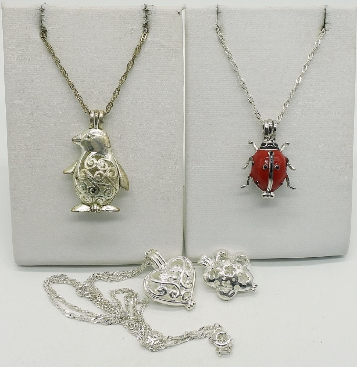 Four sterling pendants that open for scent balls. Three sterling chains, 18″ & 20″. (14.4 dwt)