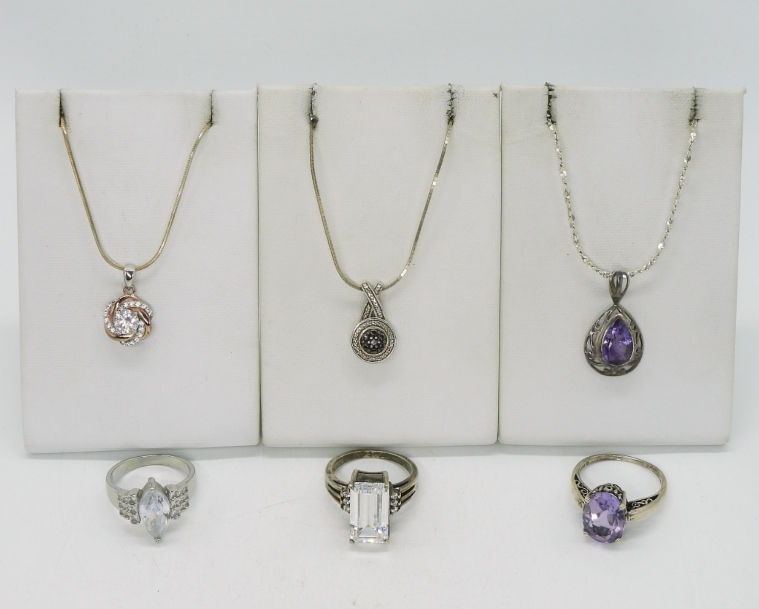 Three sterling rings, sizes 8.5, 9, 10 with amethyst and simulated diamonds. Three sterling necklaces, 18″ & 20″. (22 dwt)