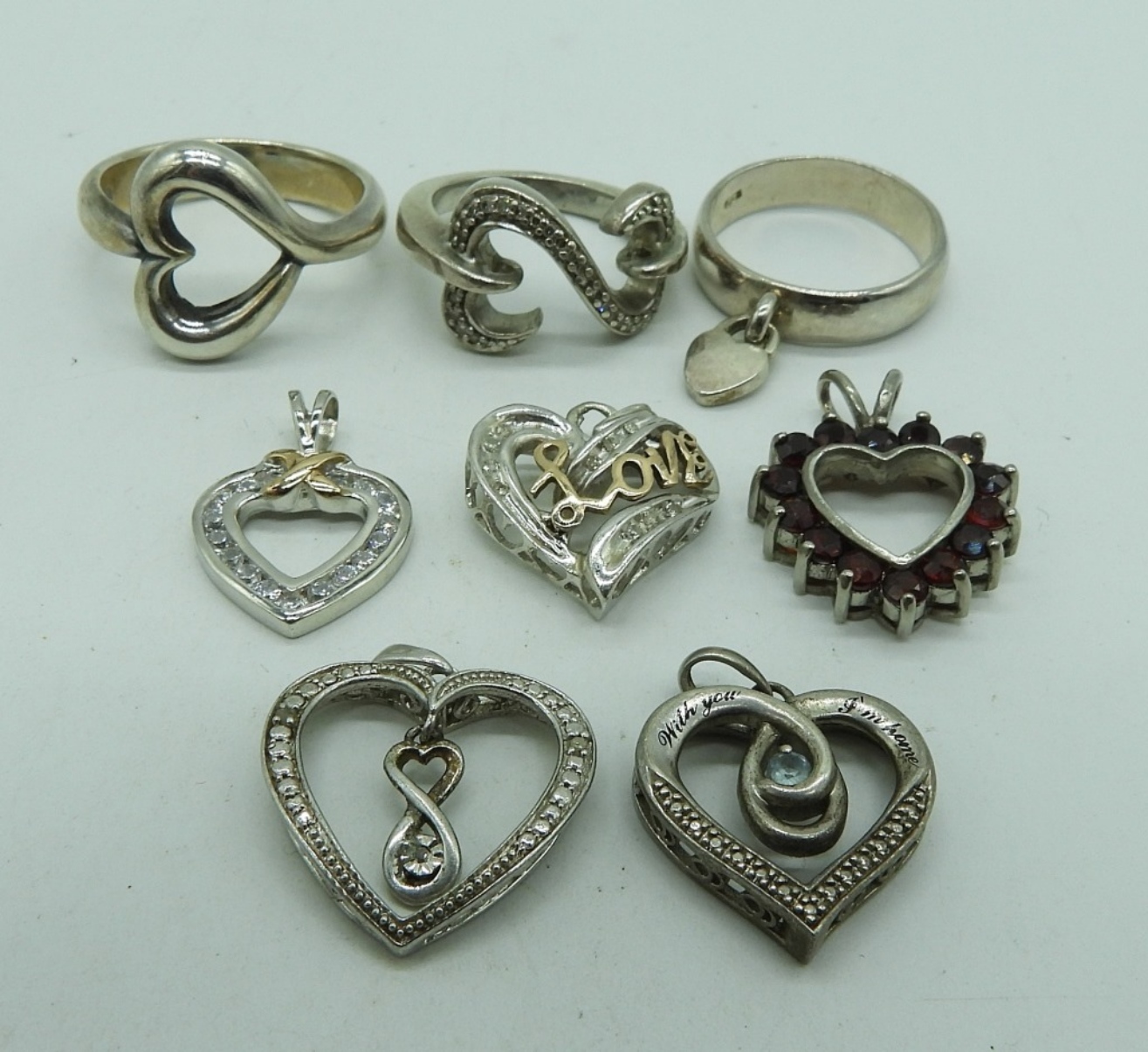 Three sterling rings, sizes 7, 8, 10. Five sterling heart shaped pendants with gemstones. (19 dwt)
