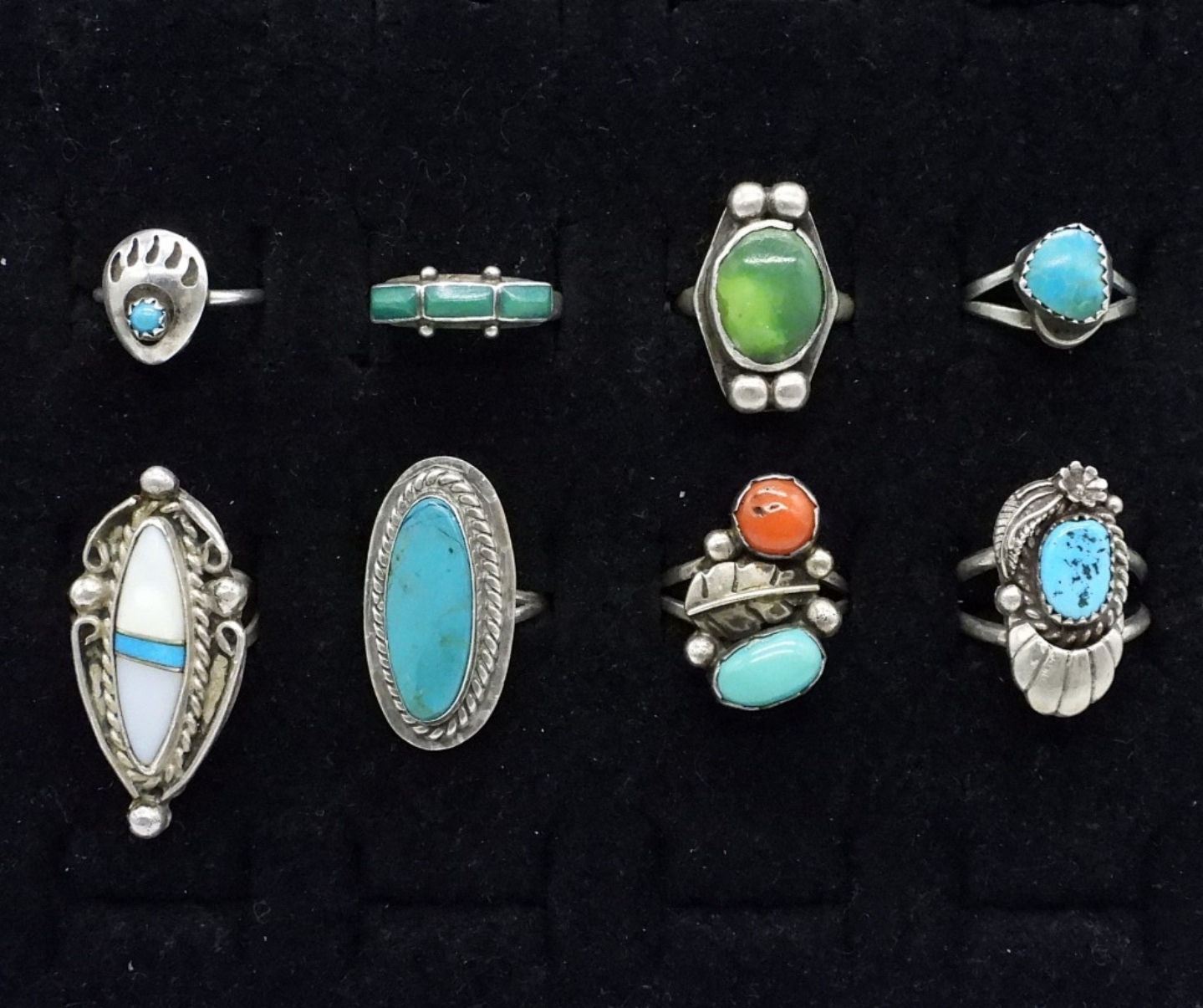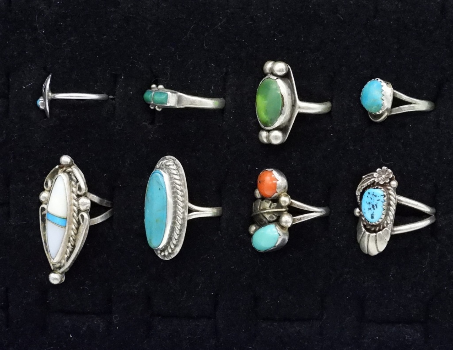 Eight sterling fashion rings with turquoise, red coral and mother of pearl gemstones. Sizes 3.5 – 7. (20 dwt)