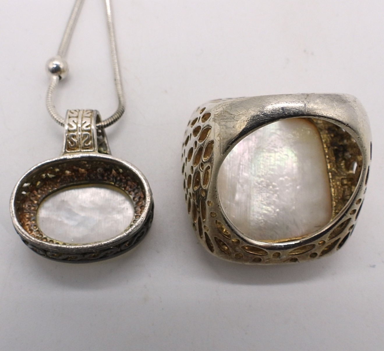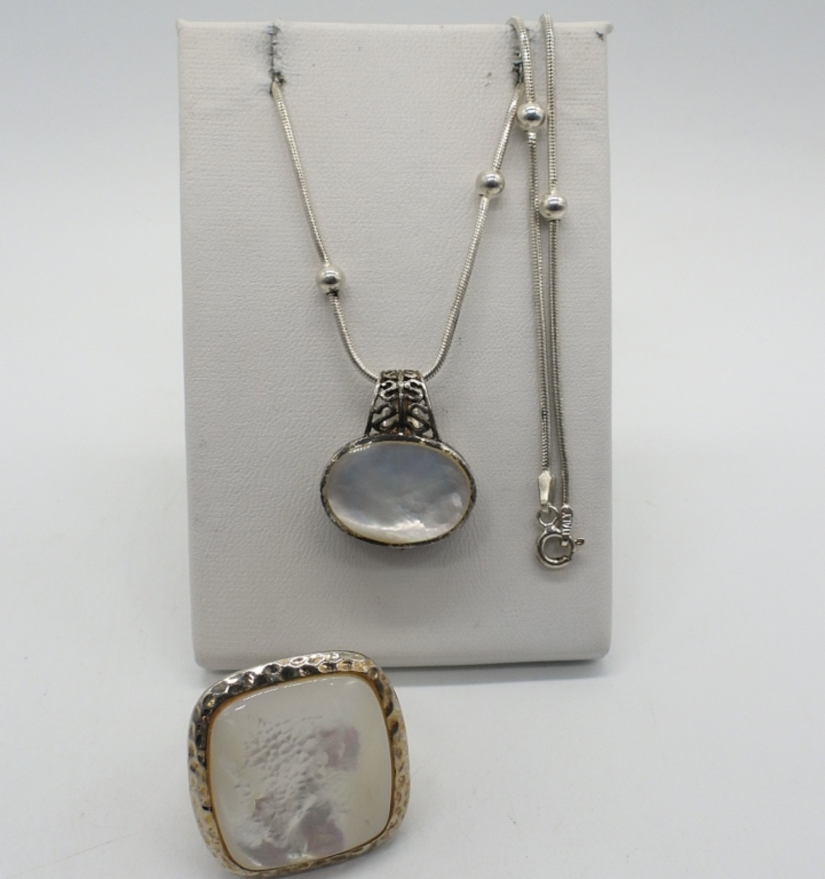 Mother of Pearl gemstone sterling ring, size 7. Necklace is 23″ long. (14 dwt)