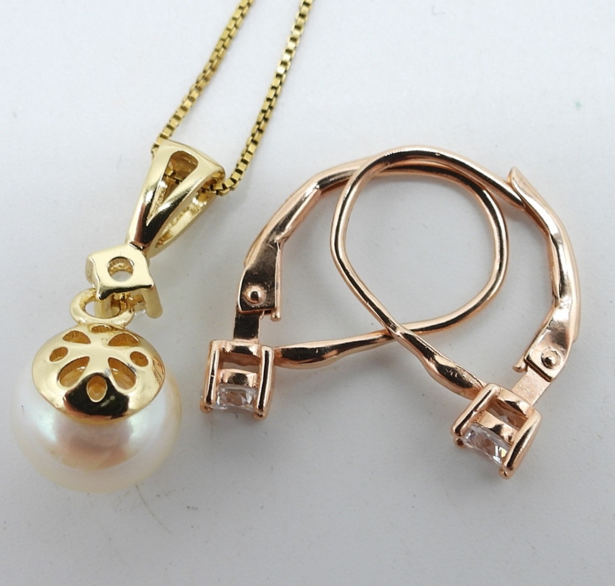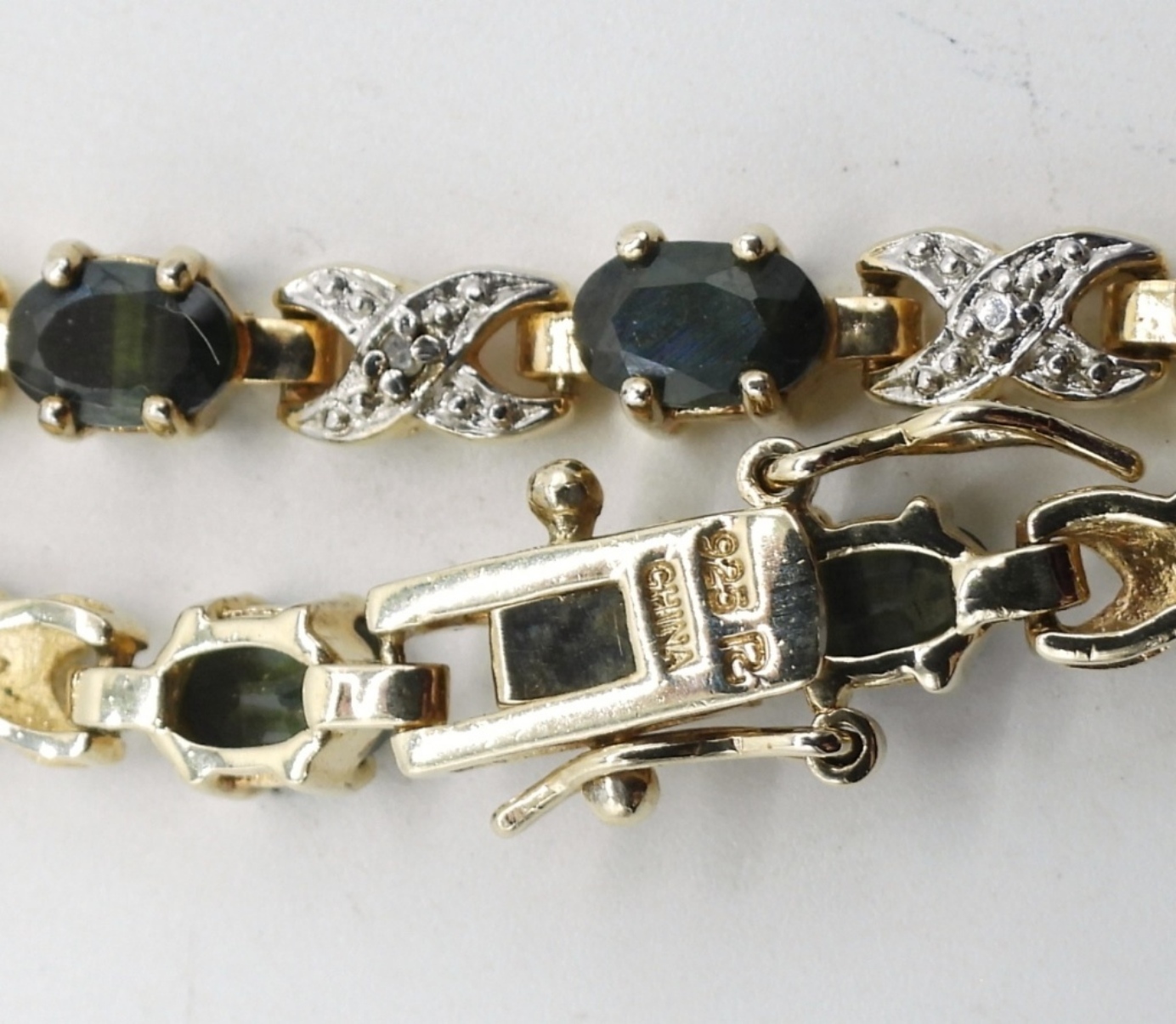 Beautiful gold tone sterling bracelet with gorgeous dark green gemstones, 7″ long. Gold tone sterling pearl necklace, 18″ long. Pierced earrings. (10 dwt)