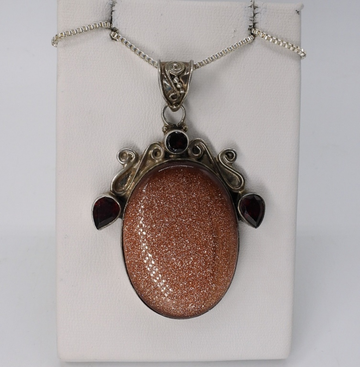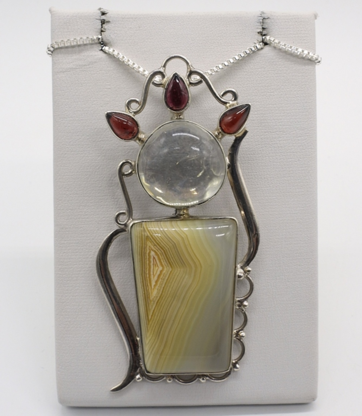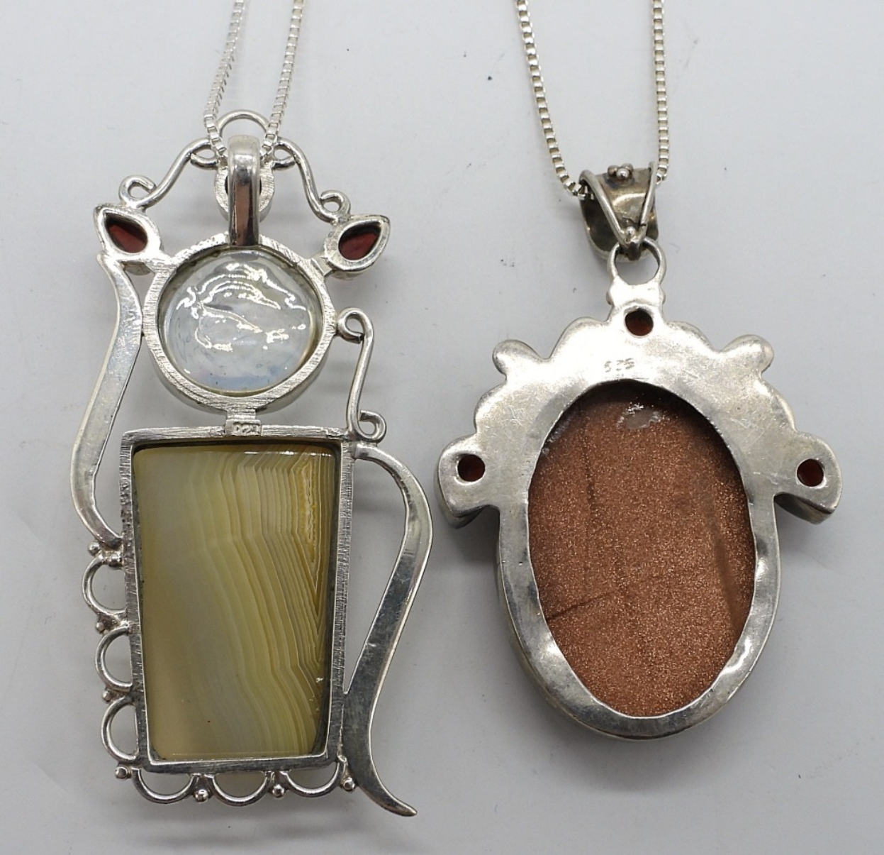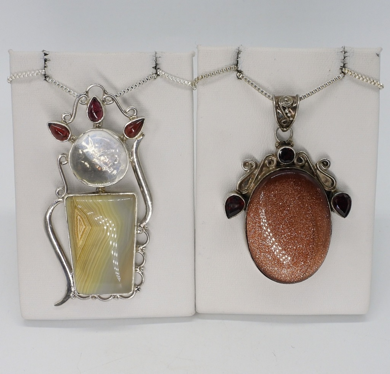 Two large sterling gemstone necklaces, both 22″ long. Gold stone with Garnet gemstones and Banded Agate with Garnet gemstones. Pendants measure 2.5-3″ long. (18 dwt)