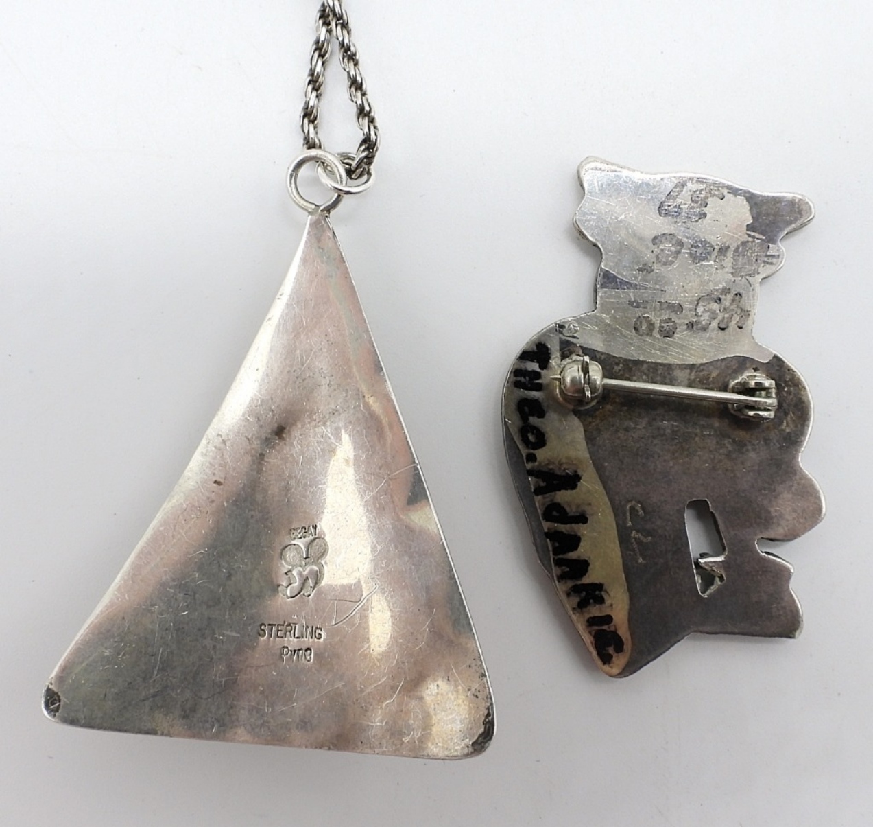 Zuni sterling owl brooch, 1 3/4″ long. Sterling gemstone pendant, 2″ long with unidentified gemstone. Marked “Begay Pyne Sterling” with a stamped logo that looks like mickey mouse. 24″ chain. (14.6 dwt)