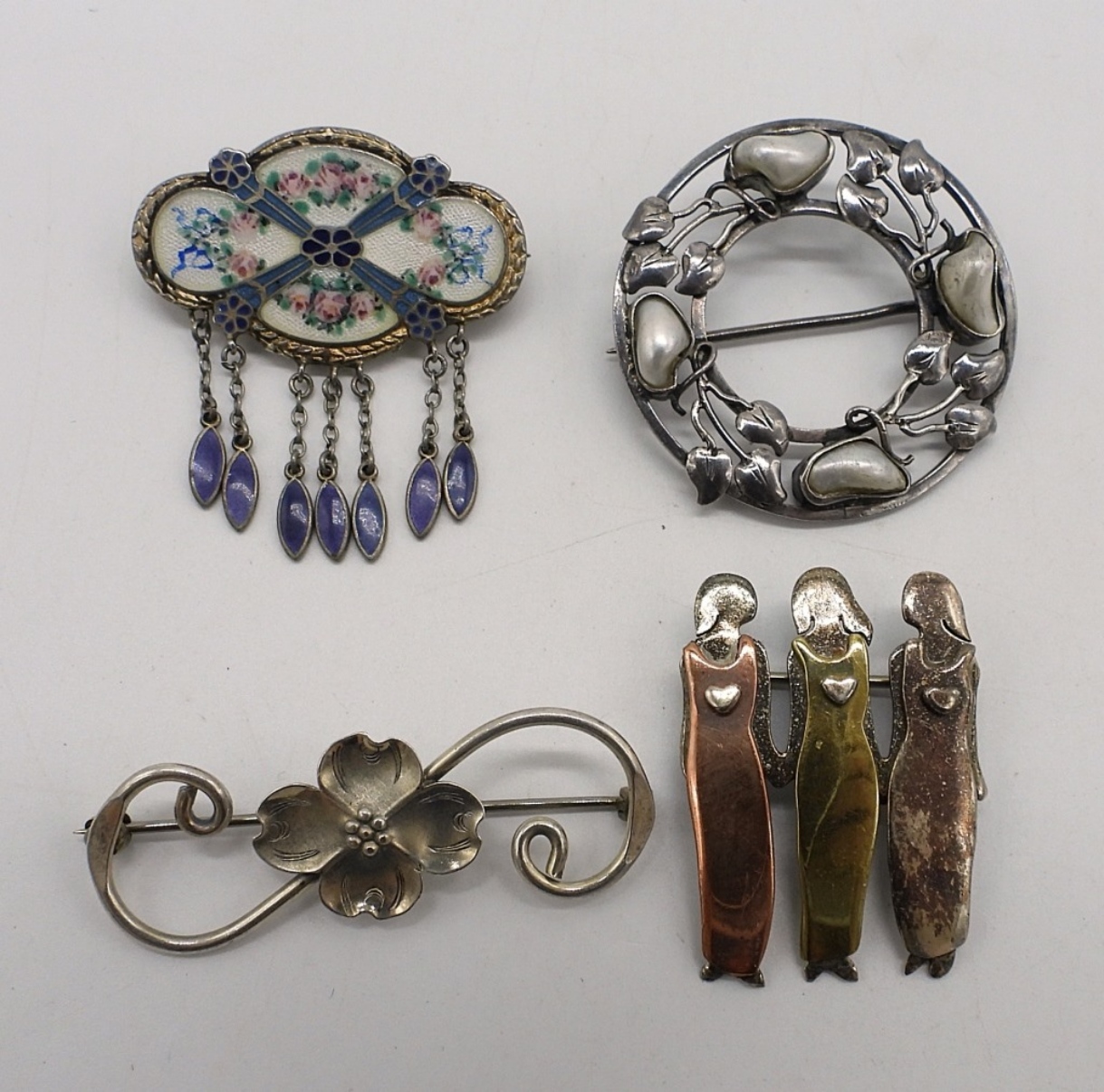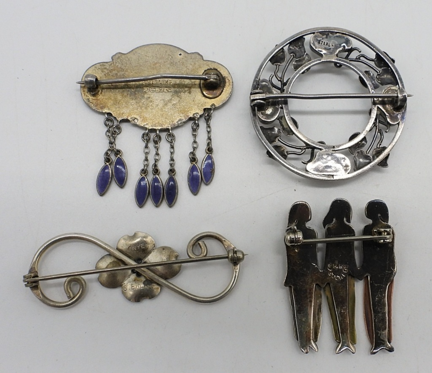 Four vintage sterling pins, 1-2″ long/wide. (14 dwt)