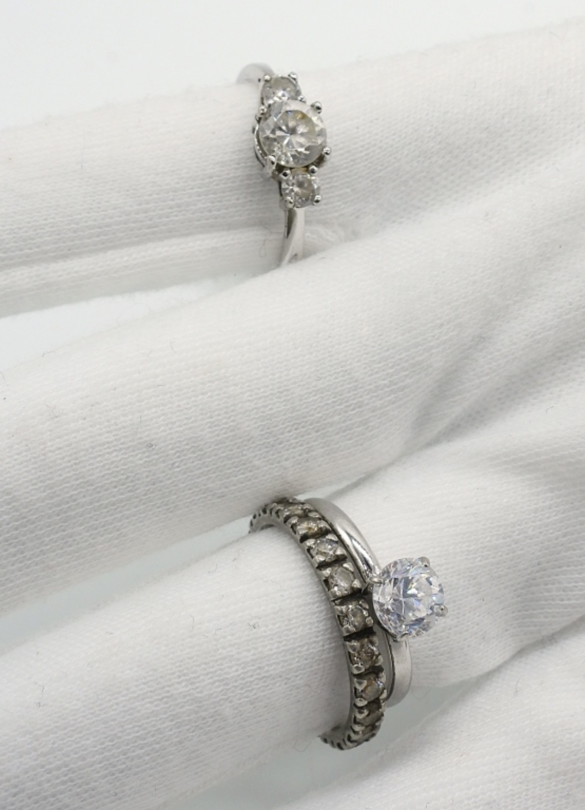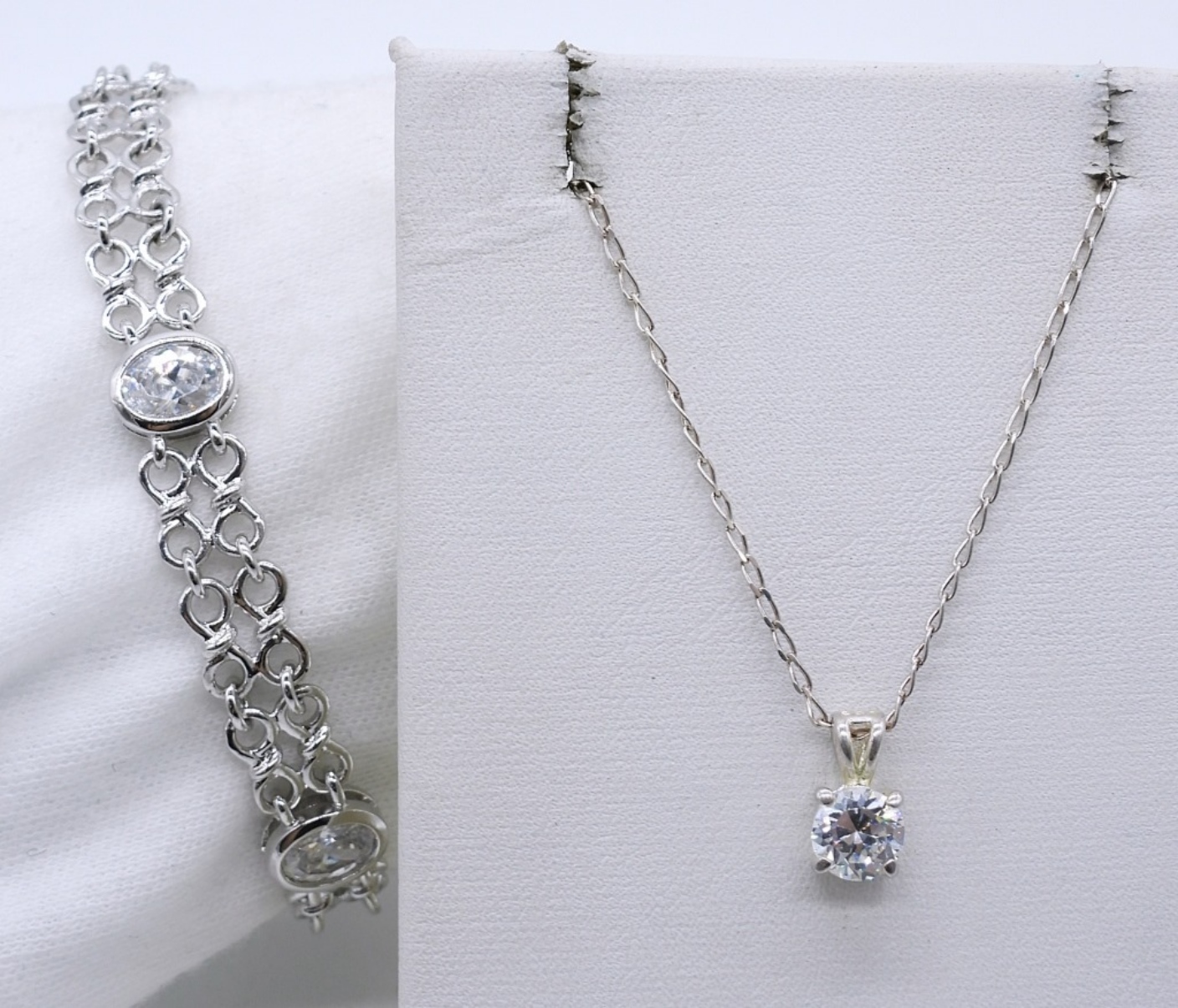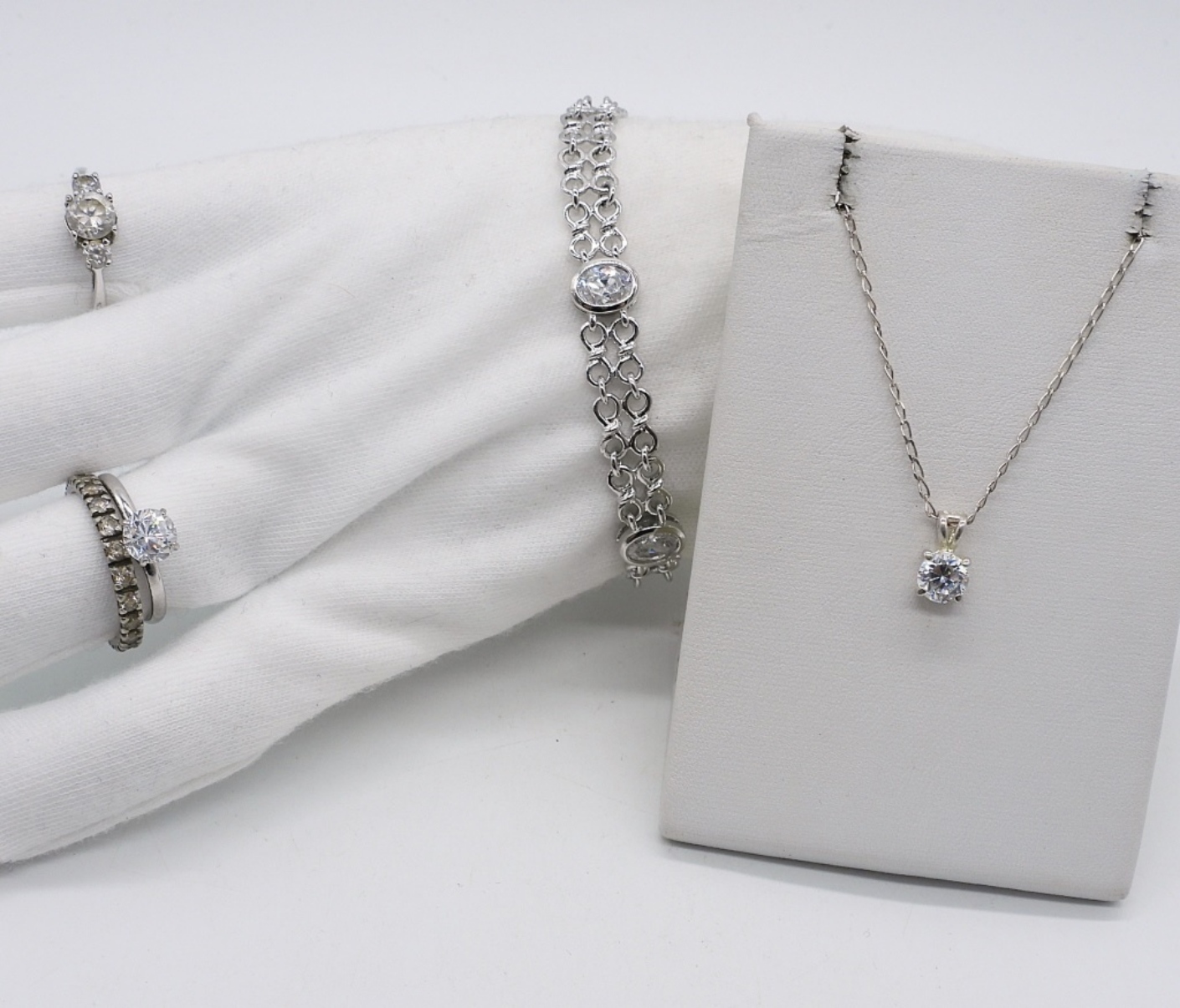 5 pieces, sterling with simulated diamond gemstones. Rings are size 6.5 & 9. Necklace is 16″ long. Bracelet is 7″ long. (14 dwt)
