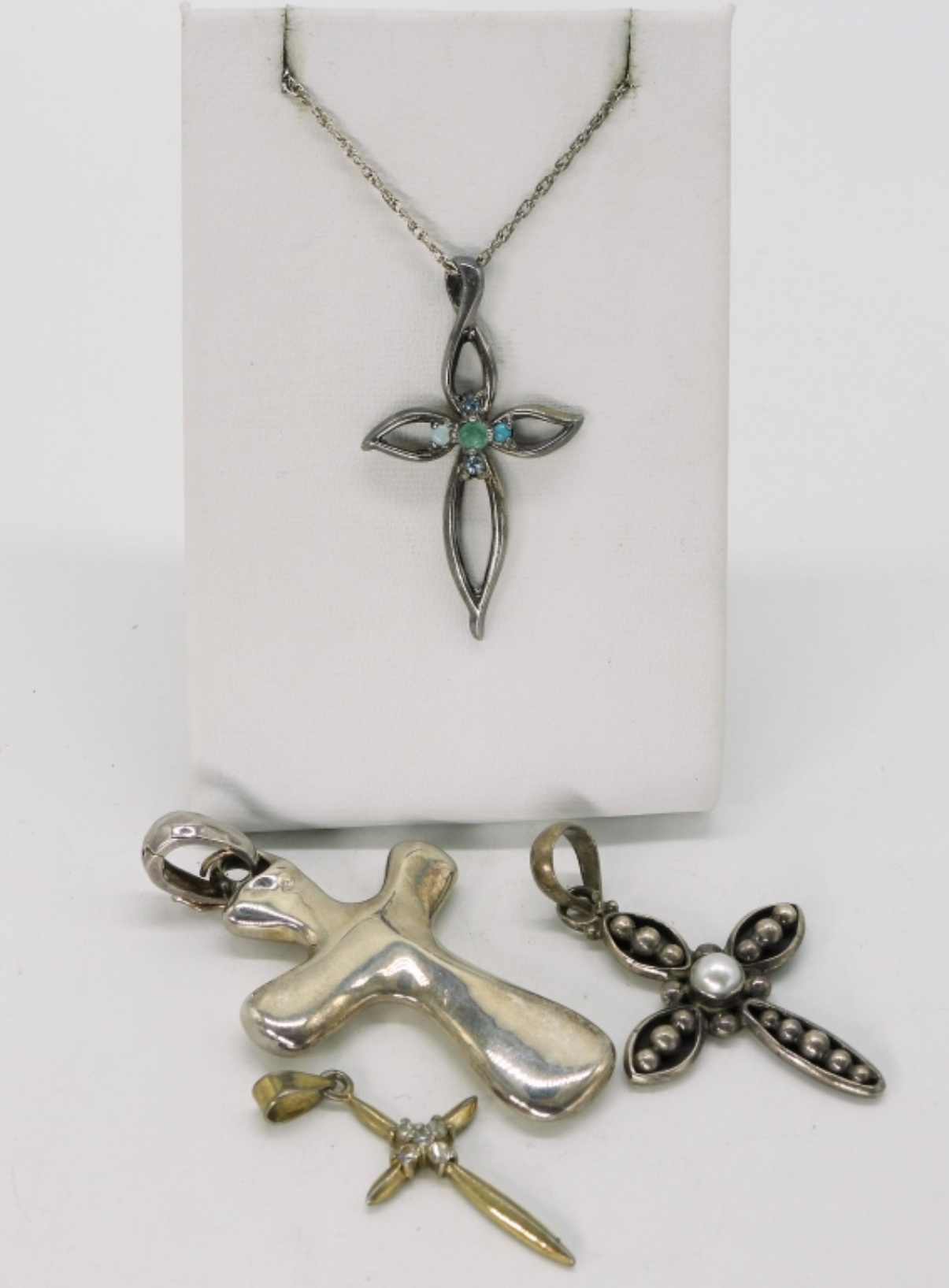 Four sterling cross pendants with a few gemstones. 1.5″ – 2.5″. Sterling chain is 20″ long. (19 dwt)