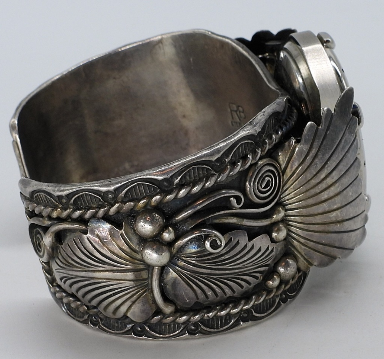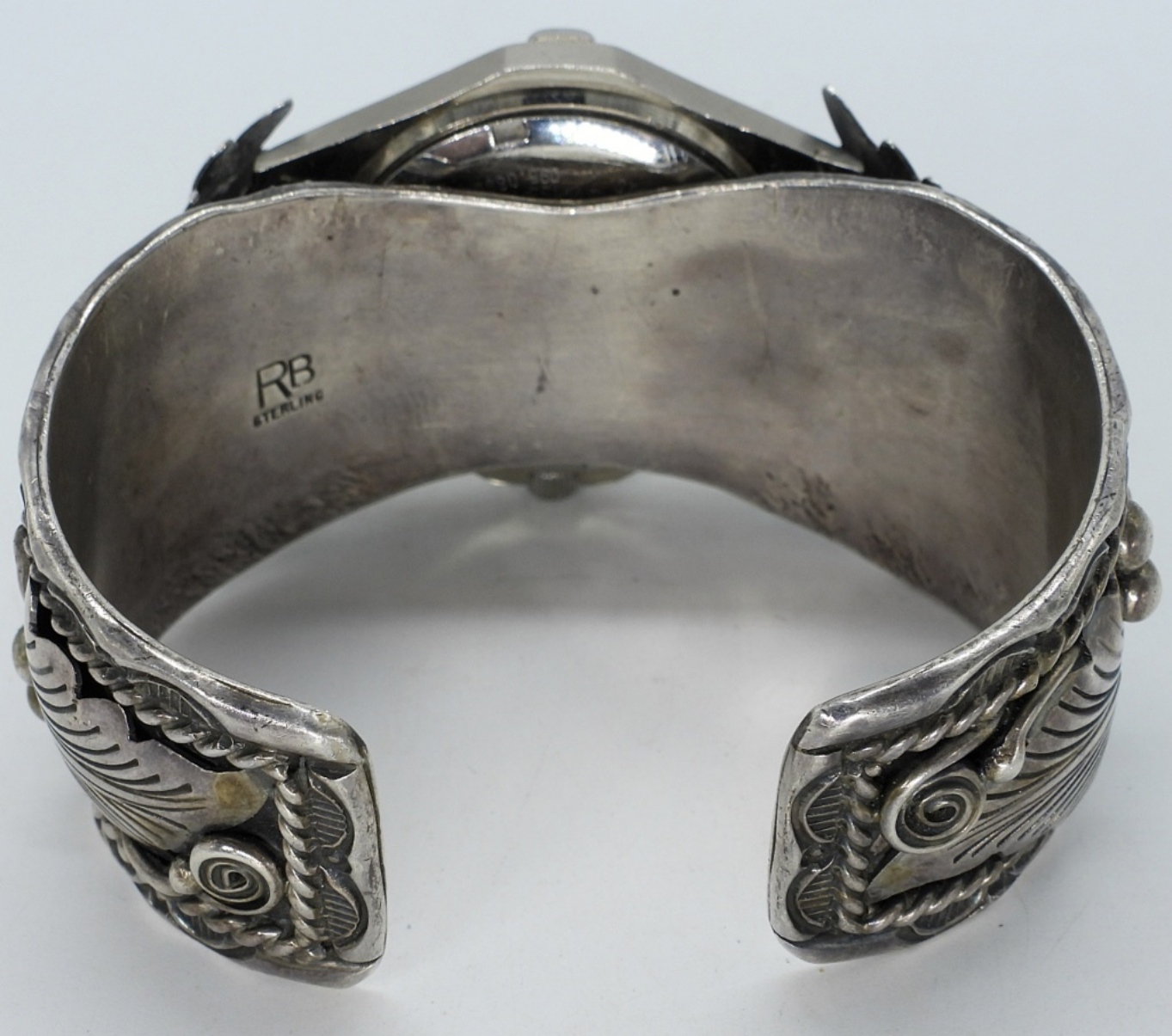 Navajo sterling watch bracelet with a Swiss Wenger Sak watch face. Watch is untested and currently not running. Sterling cuff is marked “RB Sterling”. Measure 1-1.5″ wide on the band. Very Heavy! (61 dwt)