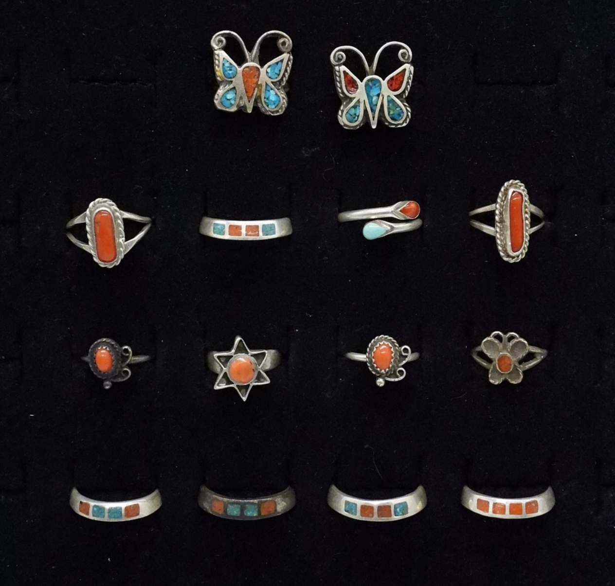 Fourteen petite sterling rings with red coral and turquoise gemstones / inlays. Sizes 3-8. (22 dwt)