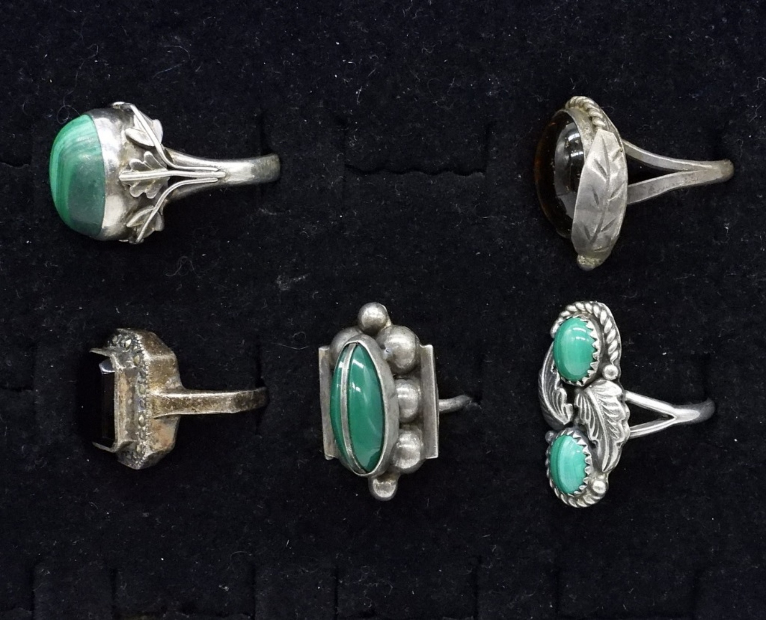 Five vintage sterling rings with Malachite, Black Onyx and Tigers Eye gemstones. Sizes 7 & 9, one is adjustable. (18 dwt)