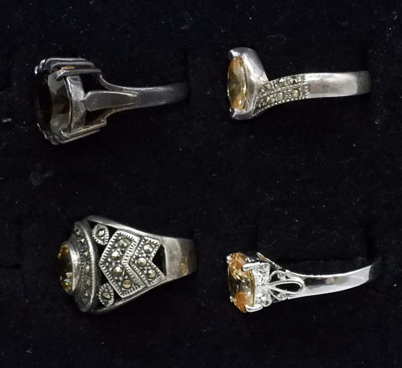 Four sterling rings. Three have a pretty champagne color gemstone ( unidentified ), and one has a smokey quartz gemstone. Rings are size 6-10. (11.4 dwt)