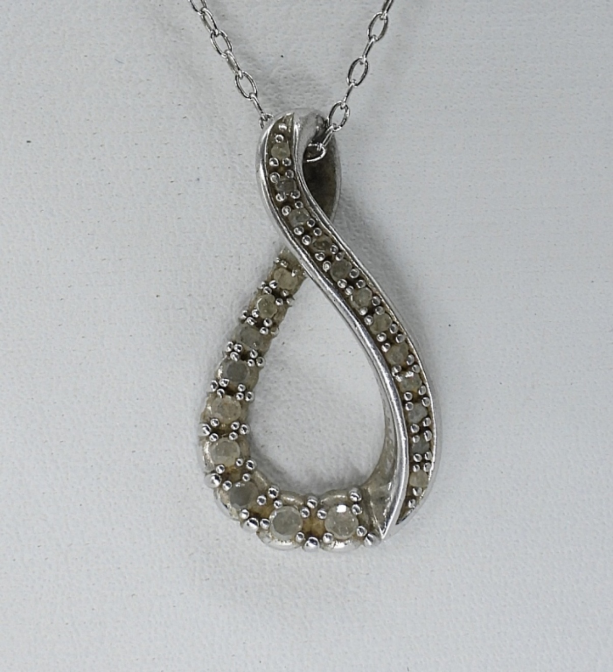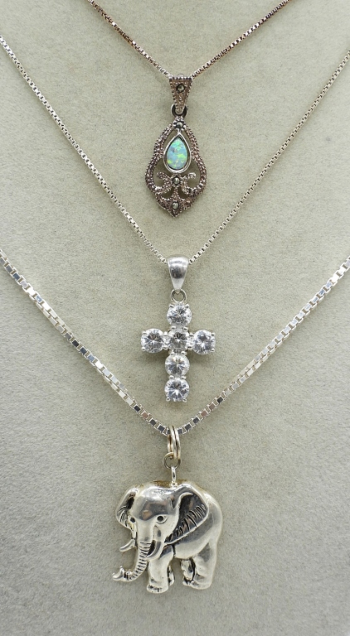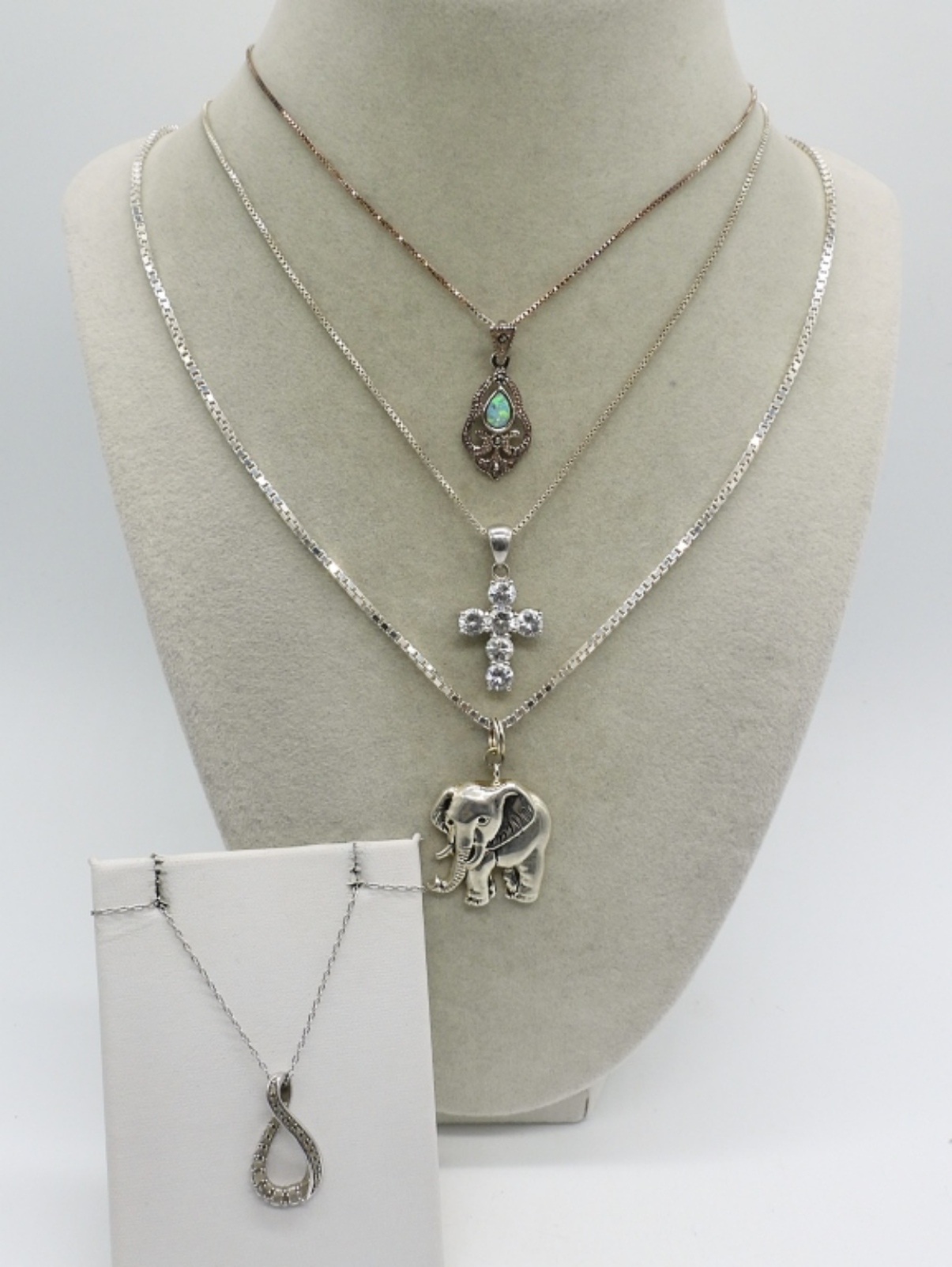 One sterling diamond necklace with very low quality, cloudy diamonds, 21″ chain. Three other sterling necklaces with simulated diamonds and opal. Chains are 18″, 20″ & 24″. (17.7 dwt)