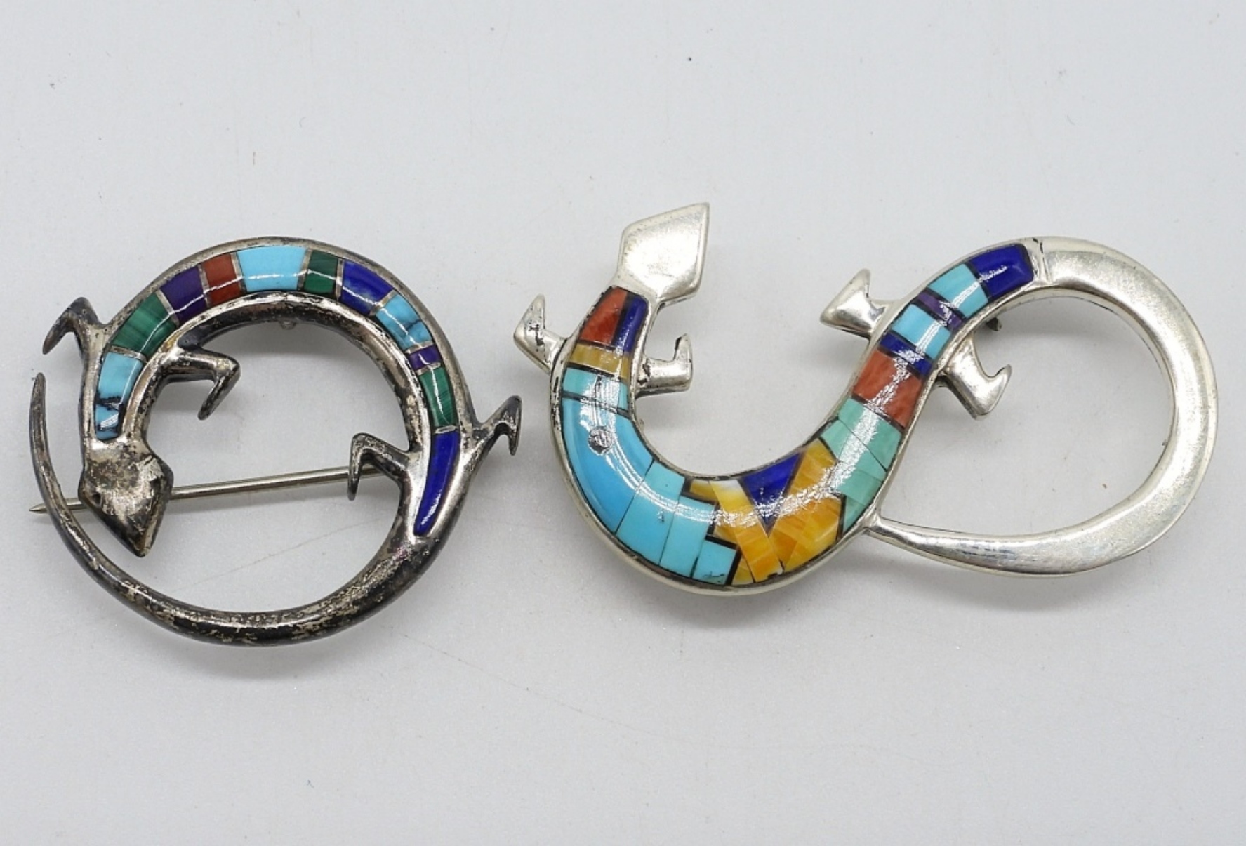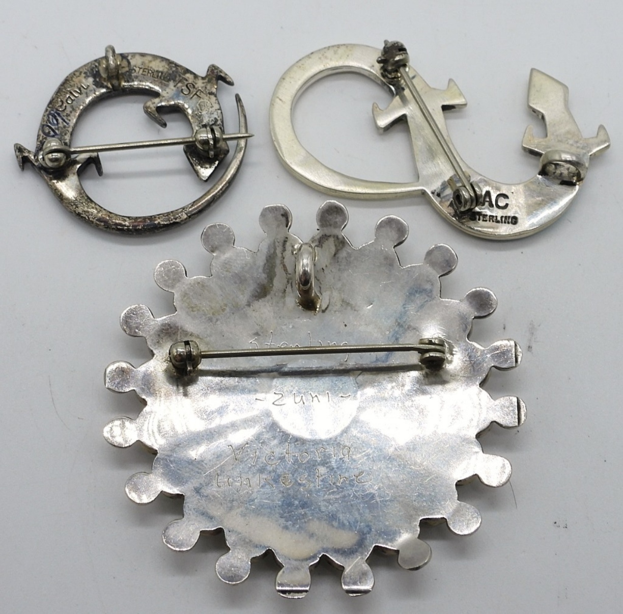 Three sterling Zuni brooches. Turquoise, mother of pearl, black onyx and more gemstones. All 3 are also pendants. 1″ & 2″. (18 dwt)
