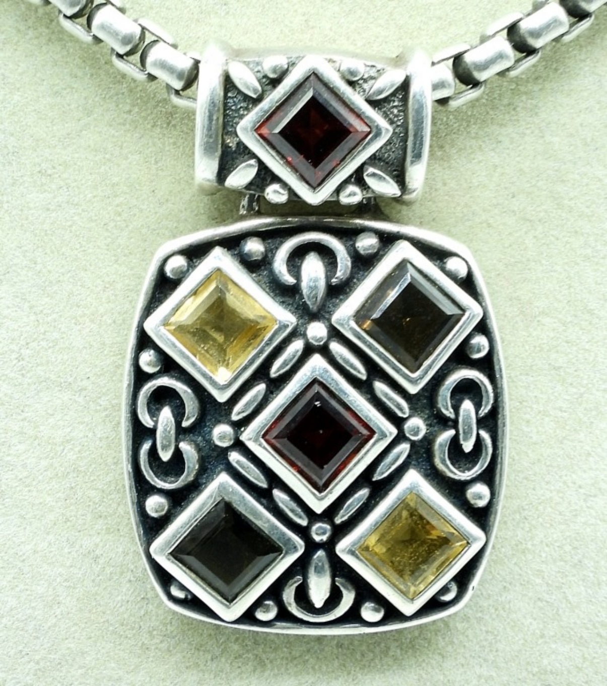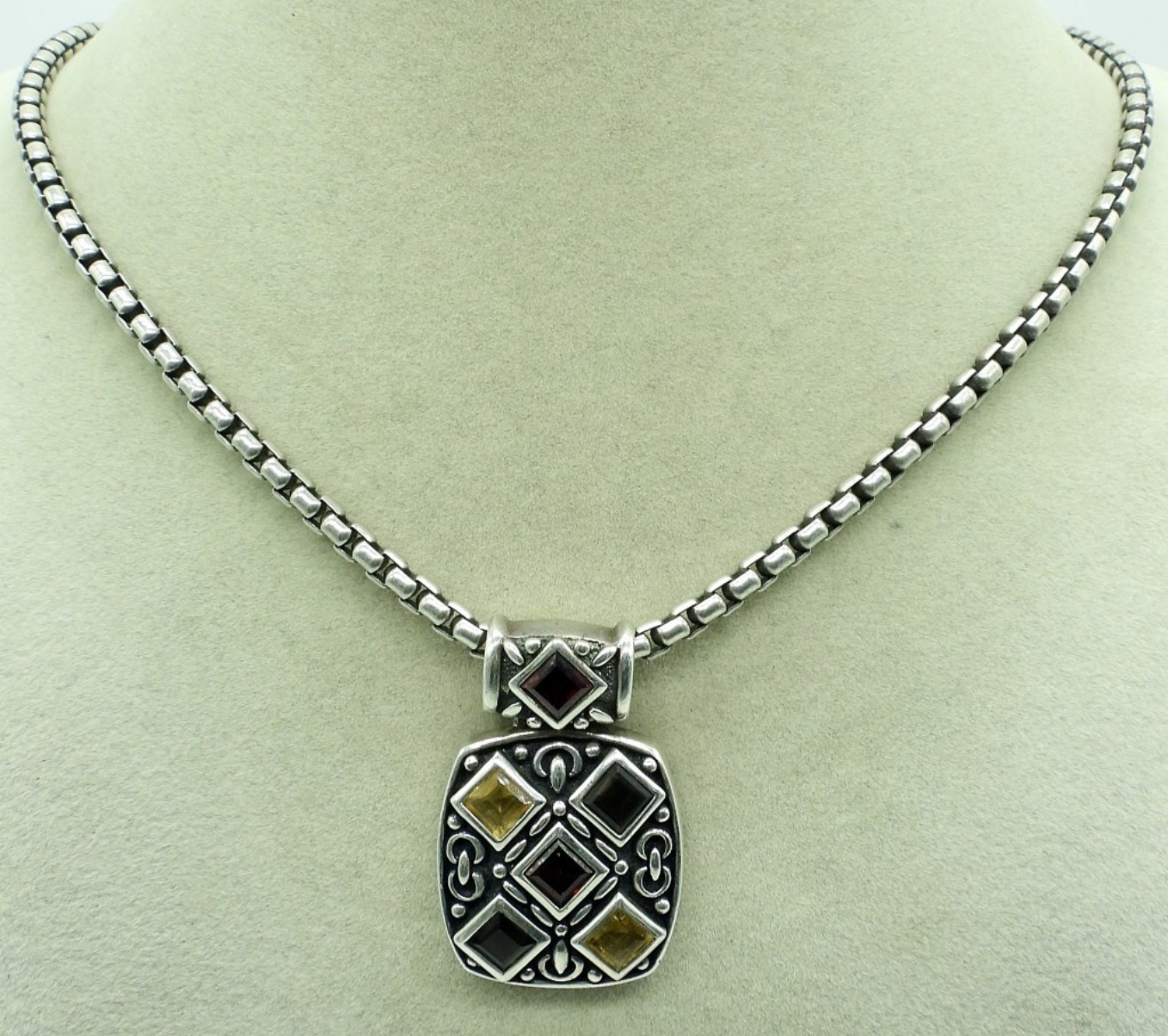 Cute sterling pendant and necklace with garnet and citrine gemstones. Chain is 18″ long. (25.6 dwt)