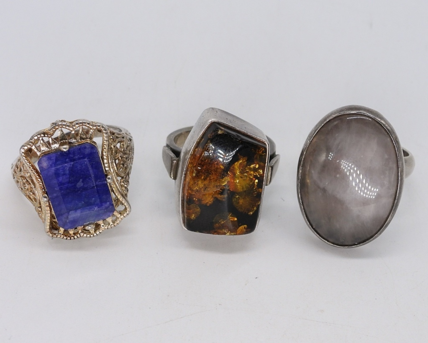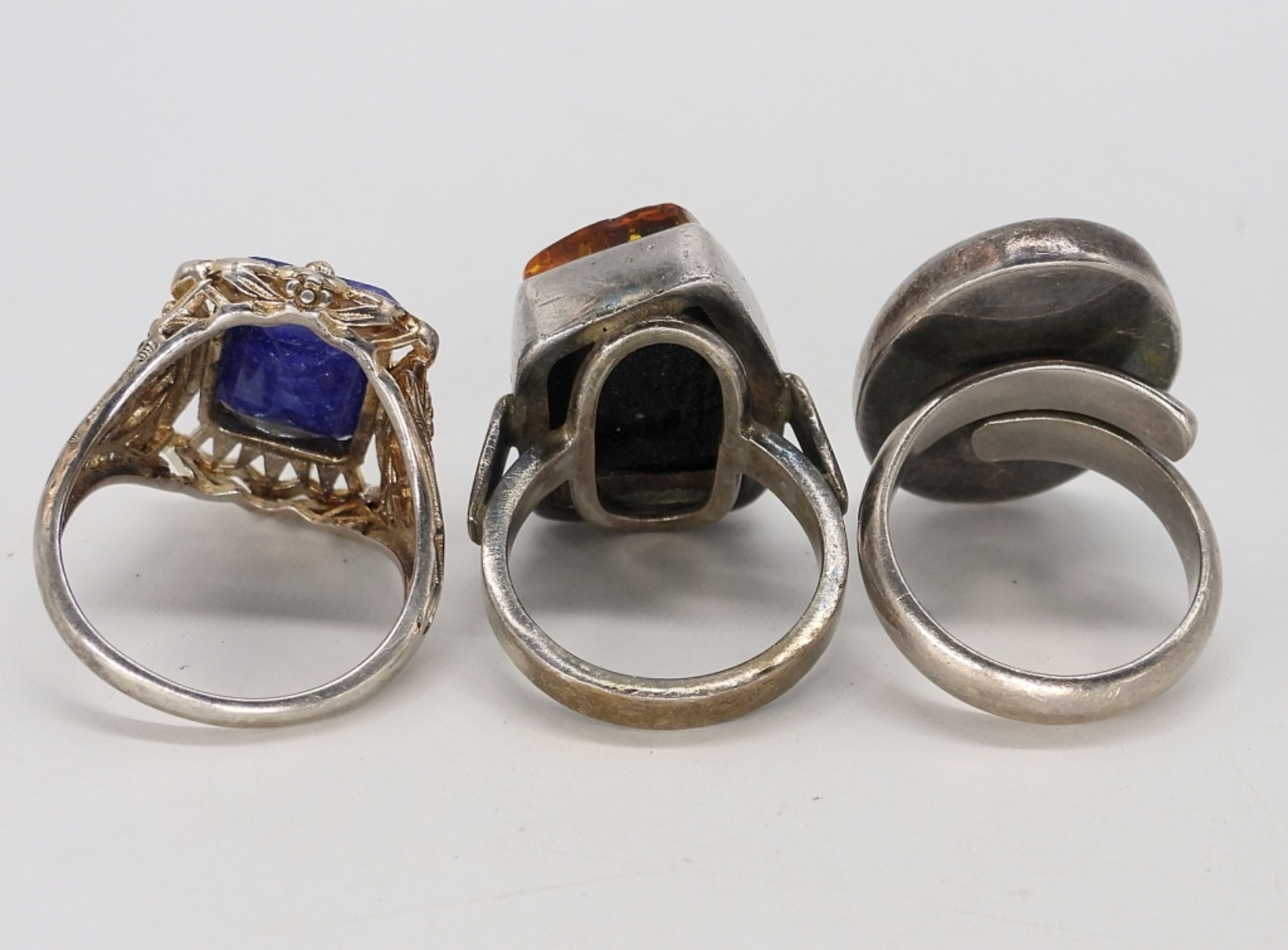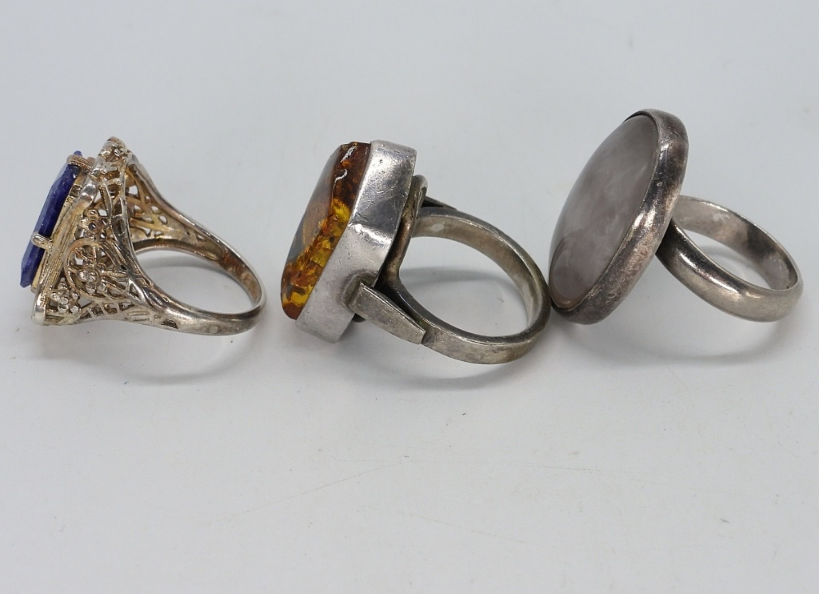 Three sterling vintage rings with Amber, Lapis Lazuli & Moonstone gemstones. Sizes 7-9 (14 dwt)