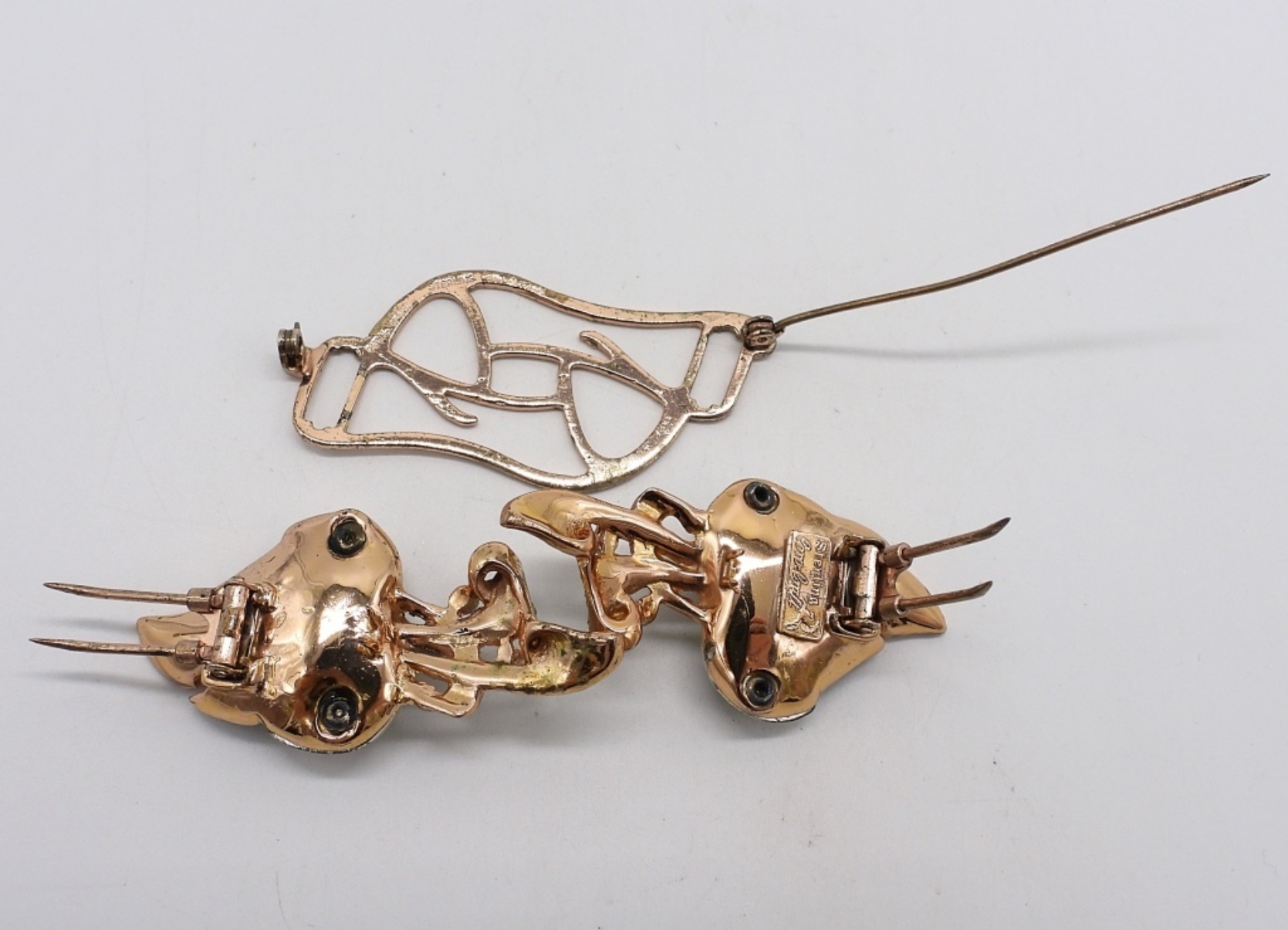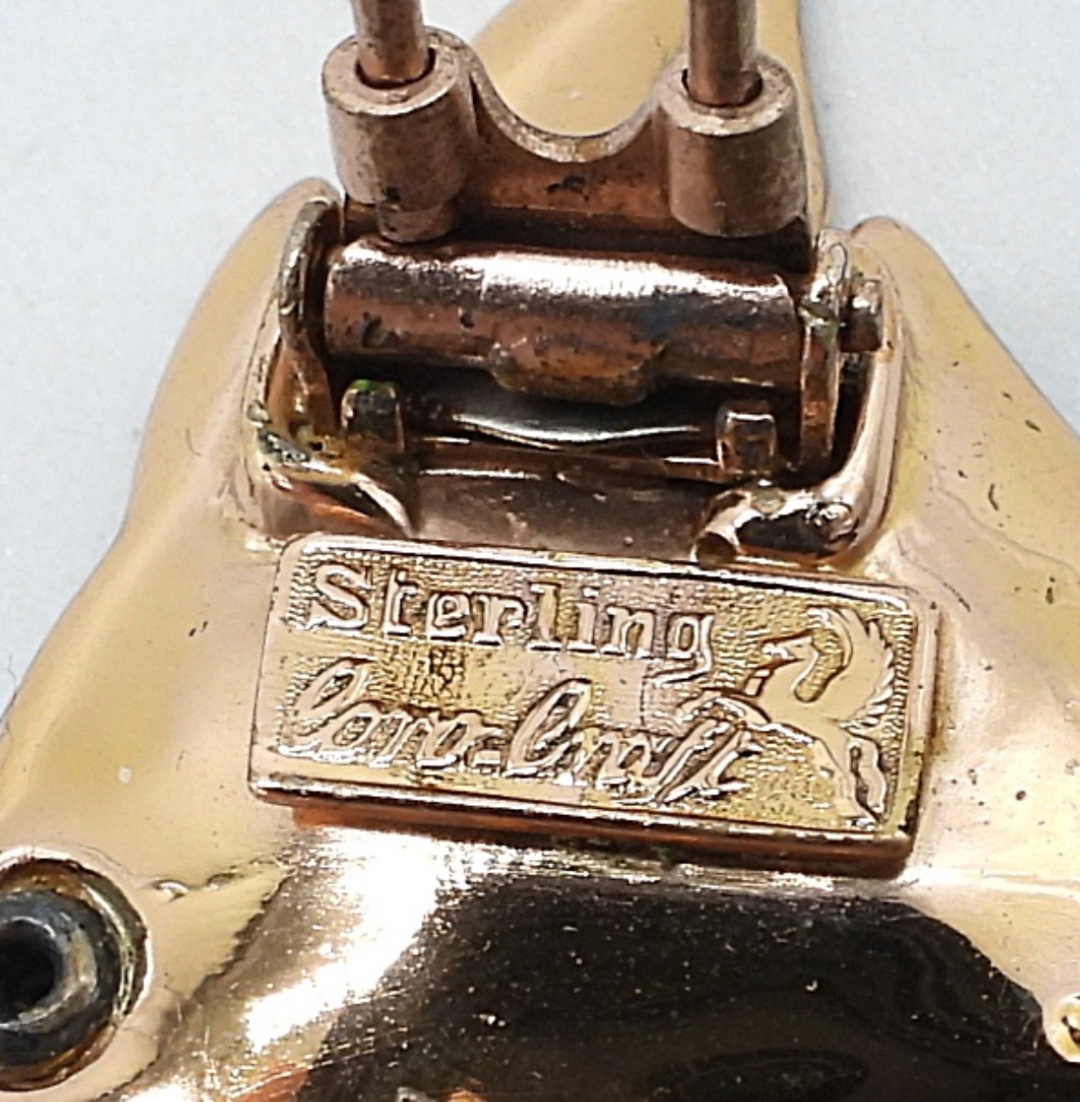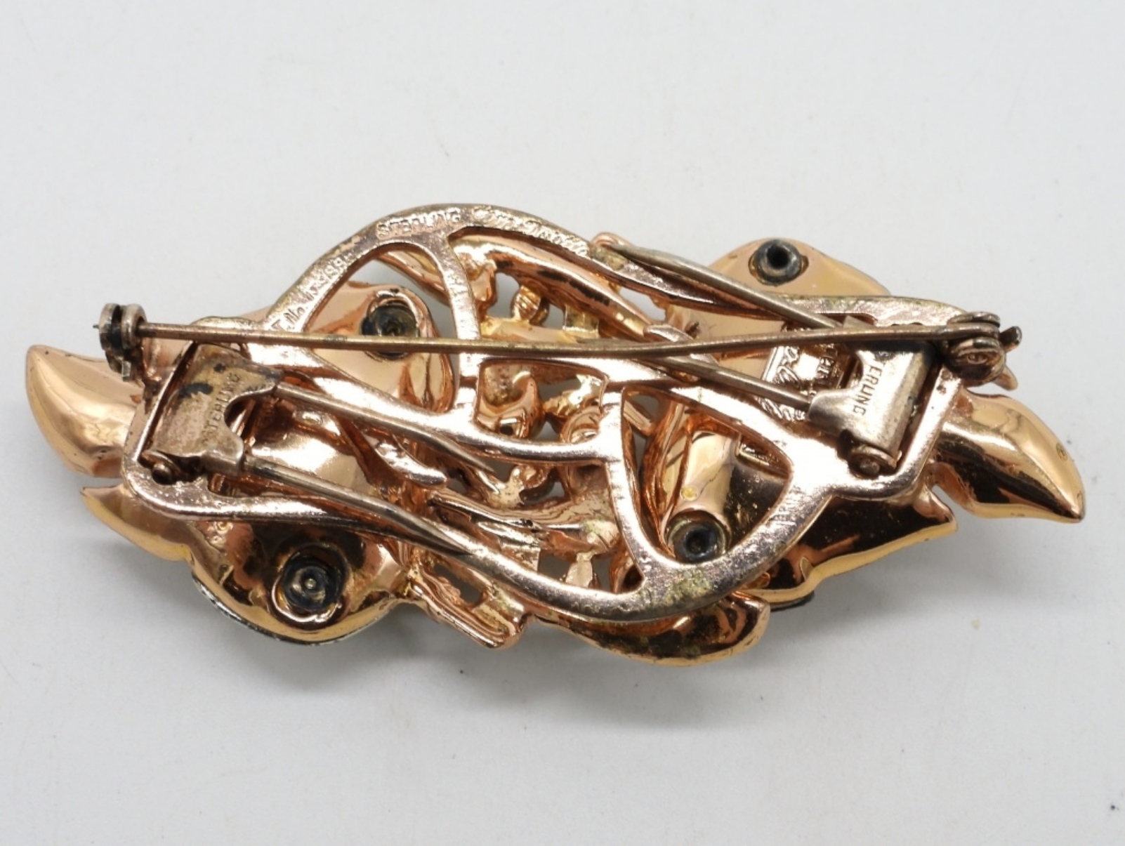 Coro Duet brooch and shoe clips, all in one. Gold tone sterling silver. 3″ wide x 1.5″ long. With clear rhinestones. (25.4 dwt)