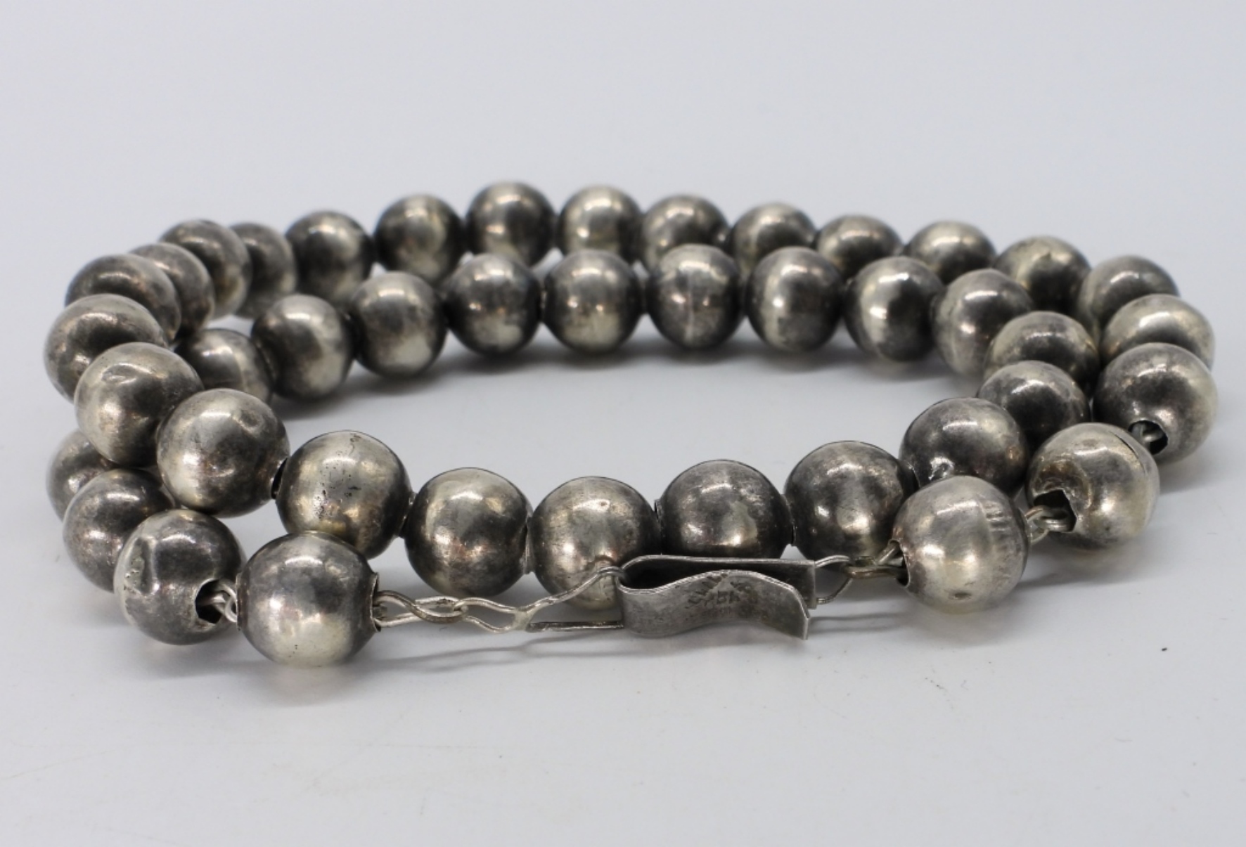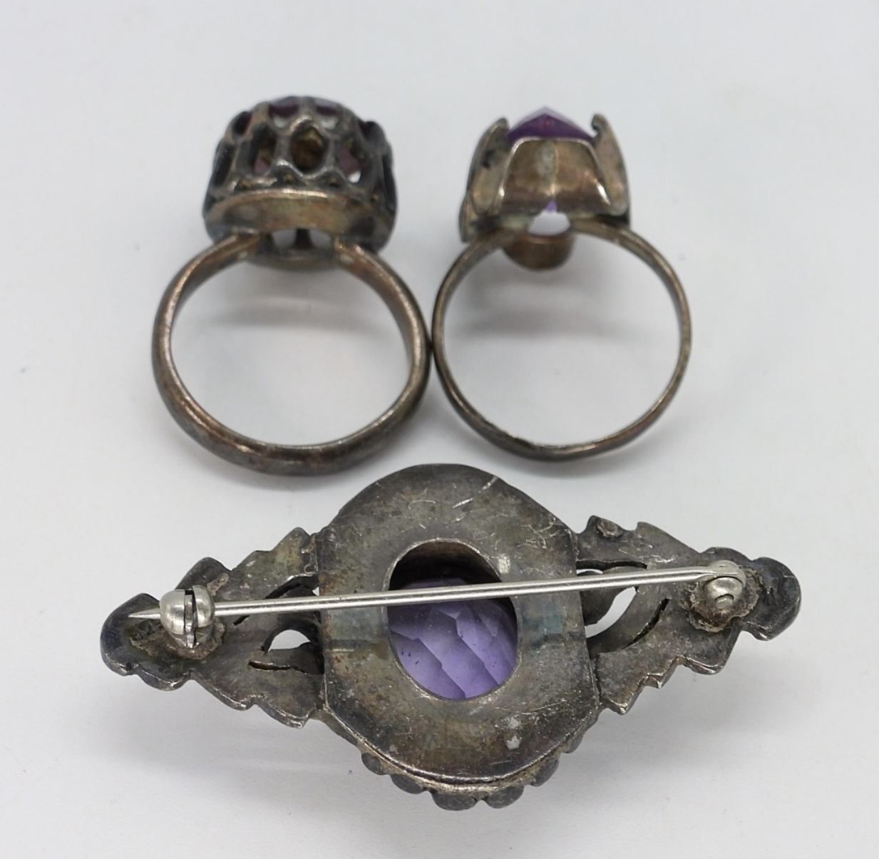 Two sterling vintage rings with amethyst gemstones, size 5 & 5.5. Brooch is 2″ wide. Sterling beaded necklace, 14″ long. (22.2 dwt)