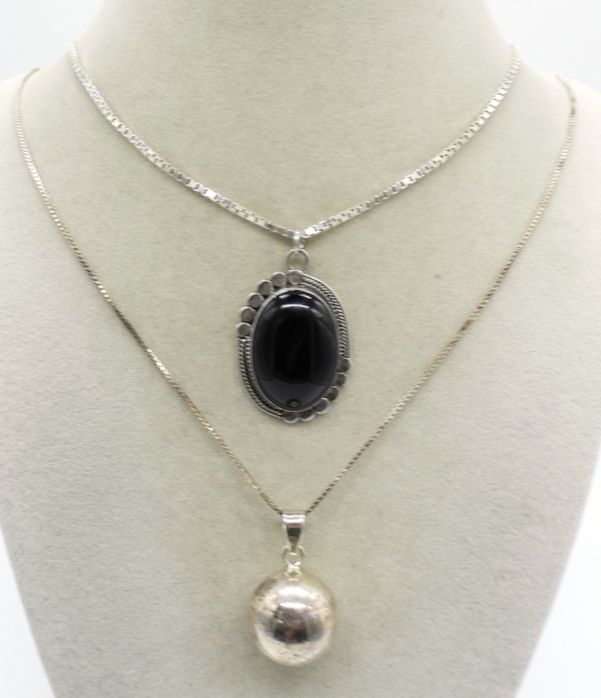 Two sterling necklaces. Black onyx pendant is 1.5″ long, on a 24″ chain. Harmony Ball sterling necklace, 24″ long, some tarnishing. (19 dwt)
