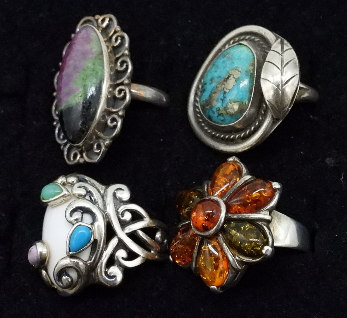 Carolyn Pollack white stone, 925 ring, size 8. Amber ring, size 6. Turquoise ring, size 7. Ruby Zoisite ring, size 7. (20 dwt)