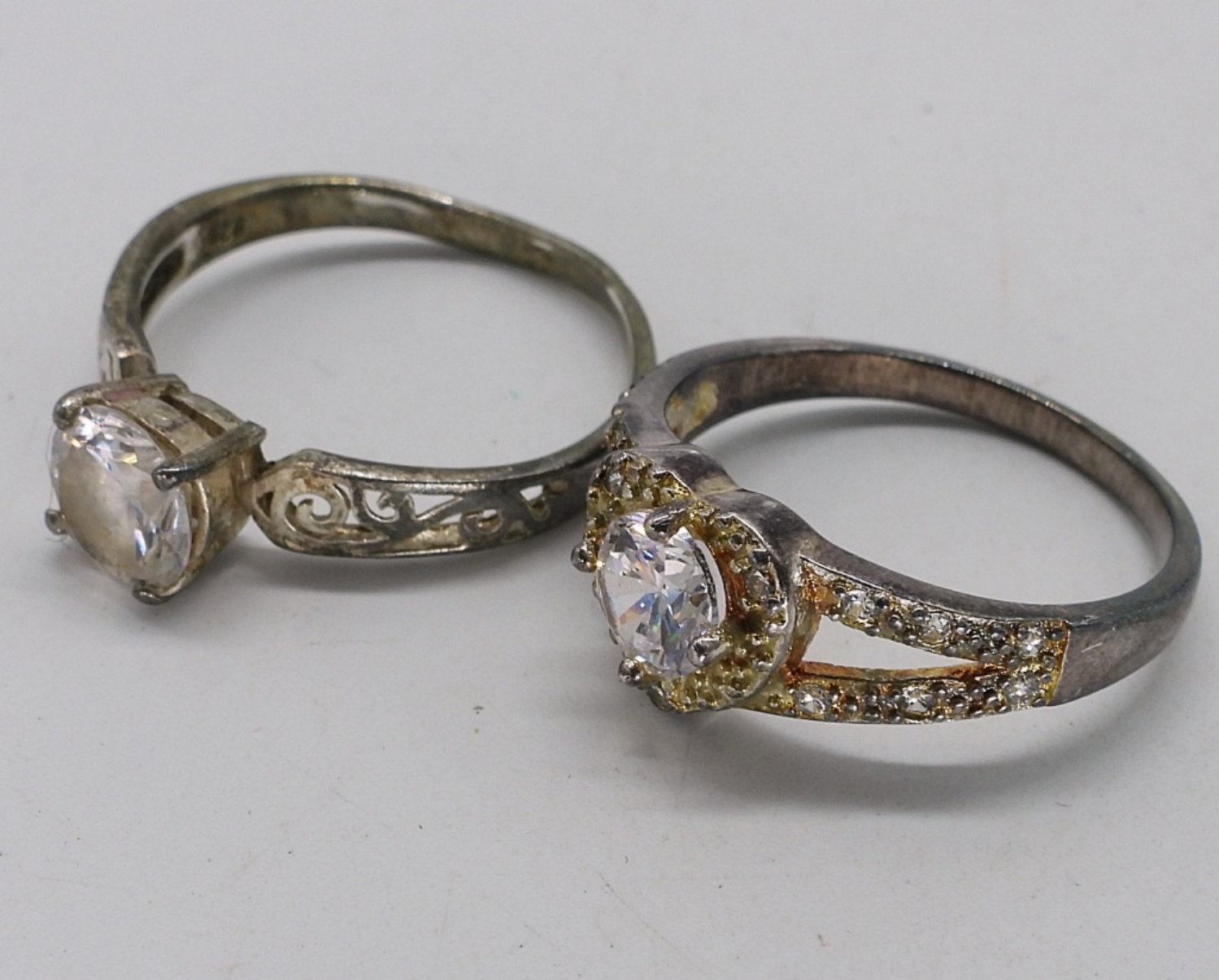 Fashion Sterling bracelet, 7.5″. Two rings, simulated diamonds, sizes 8 & 9. Pierced sterling hoops. (12 dwt)