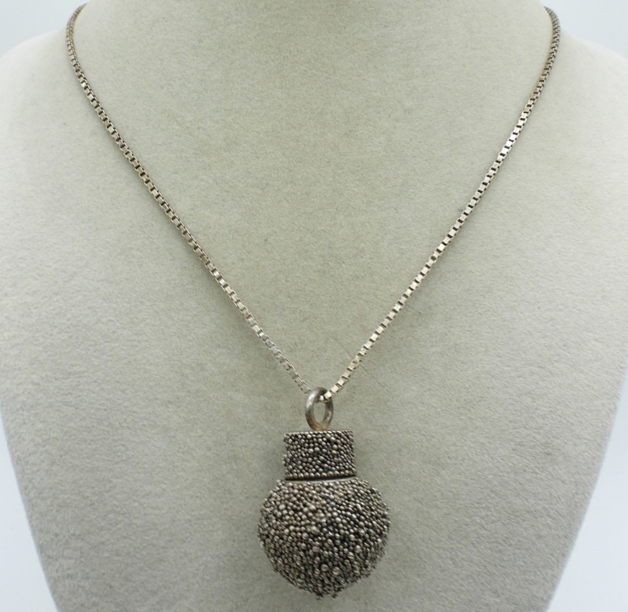 Sterling perfume pendant necklace. Pendant measures 1.5″. Sterling chain is 29″ long. (17.8 dwt)
