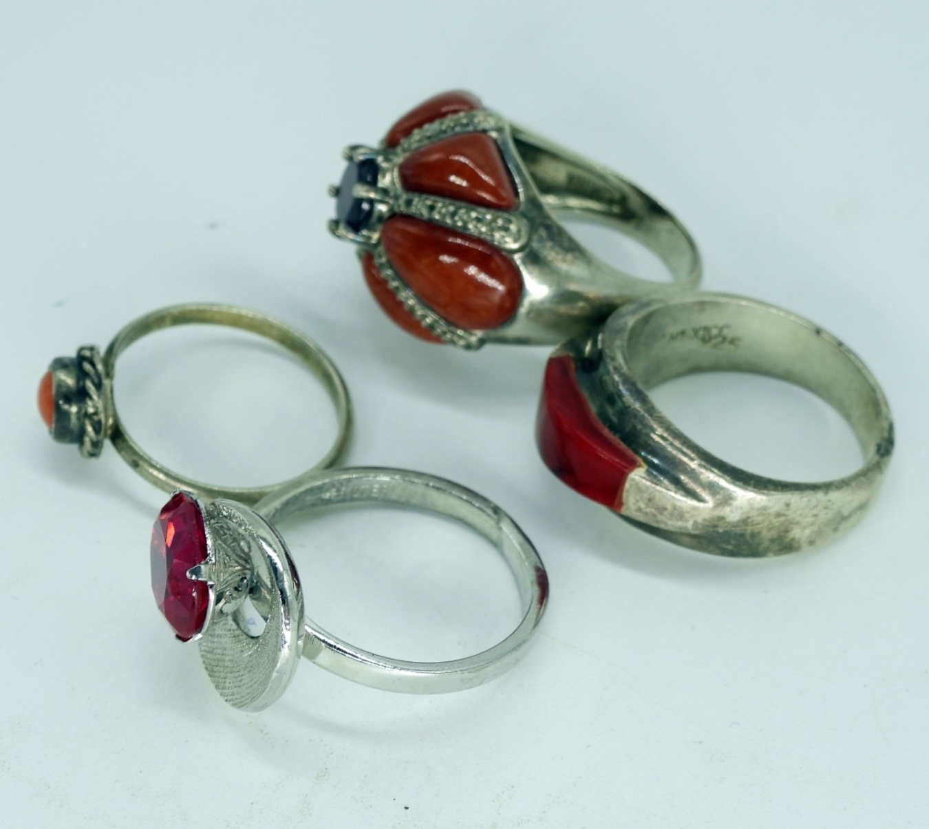 Four sterling rings, sizes 6, 8, 9. One pair of vintage sterling pierced earrings with carnelian gemstones, 2″ long. (24 dwt)
